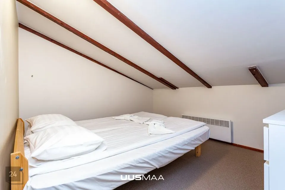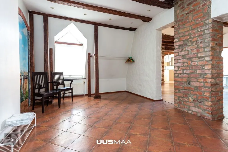 Korteris on säilinud ja eksponeeritud ajaoolised puidust lae- ja kandetalad. Aktsenti annavad põneva kujuga aknad ning osaliselt eksponeeritud punastest tellistest seinafragmendid, õdusat äraolemist võimaldab kamin elutoa osas.
