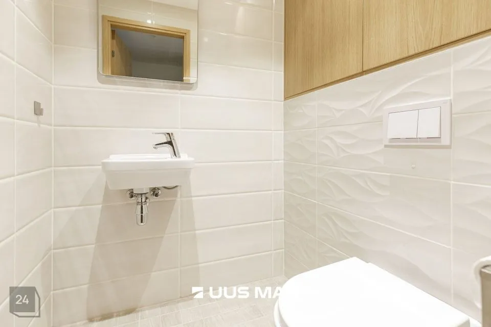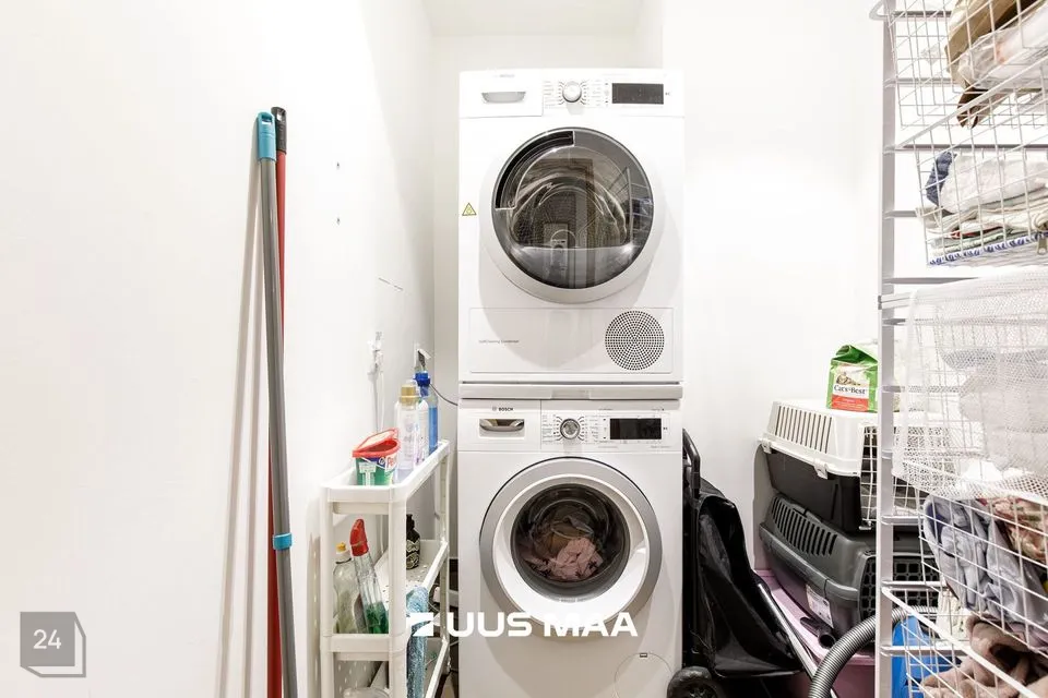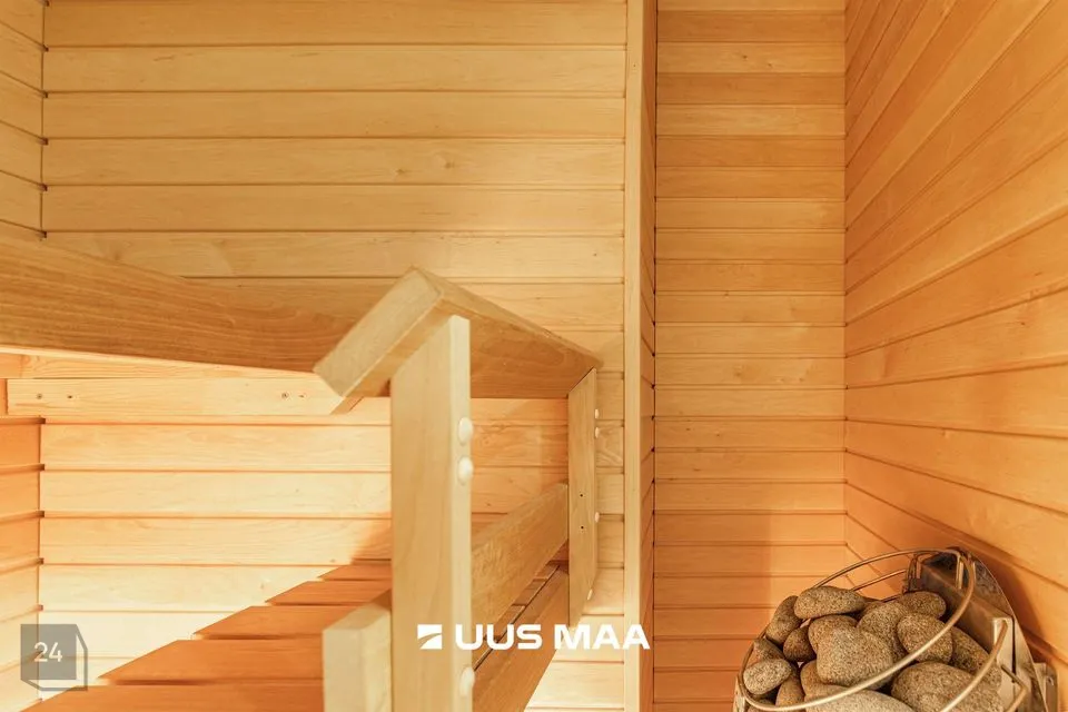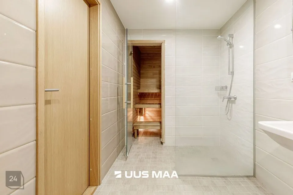 Kogu sisustus jääb korterisse – mööbel, tehnika ja grill rõdul. Suures vannitoas on kvaliteetse HUUM kerisega saun, vann ja dušš. Lisaks on olemas ka teine WC väikse valamu ja hoiukapiga. Korteri sahvris on koht kuivati ja pesumasina jaoks ning mahukad hoiukorvid, mis tagavad piisava hoiuruumi.