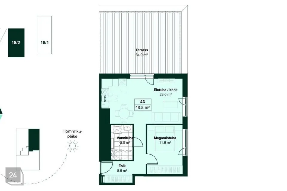 Aiandi 18 neljakordse ja kaheksakordse elamu kodud asuvad kaasaegses naabruskonnas, kus elamu ümber lisavad looduse ilu viljapuud ja lopsakad põõsad. See loob rahuliku keskkonna, kus lapsed saavad oma kodu hoovis naabrilastega sõbruneda ning kõik pereliikmed puhkehetkedel lõõgastuda. Kodud on hoolikalt planeeritud, maast laeni aknad täidavad ruumid loomuliku valgusega, luues avara ja kutsuva atmosfääri. Nutikate planeeringutega kodudes on palju ruumi ning nišid, kuhu saad paigutada sisseehitatud kapid, mis aitavad hoida kodu korras ja kõik vajaliku käepärast. Varakult valides on sul võimalus kasutada sisearhitekti poolt koostatud viimistluspakette, et luua täiuslikult isikupärane kodu. Lisaks pakume Bonavalt tellitavat kvaliteetset köögilahendust, mis on juba sinu uude koju paigaldatud ja kasutamiseks valmis.