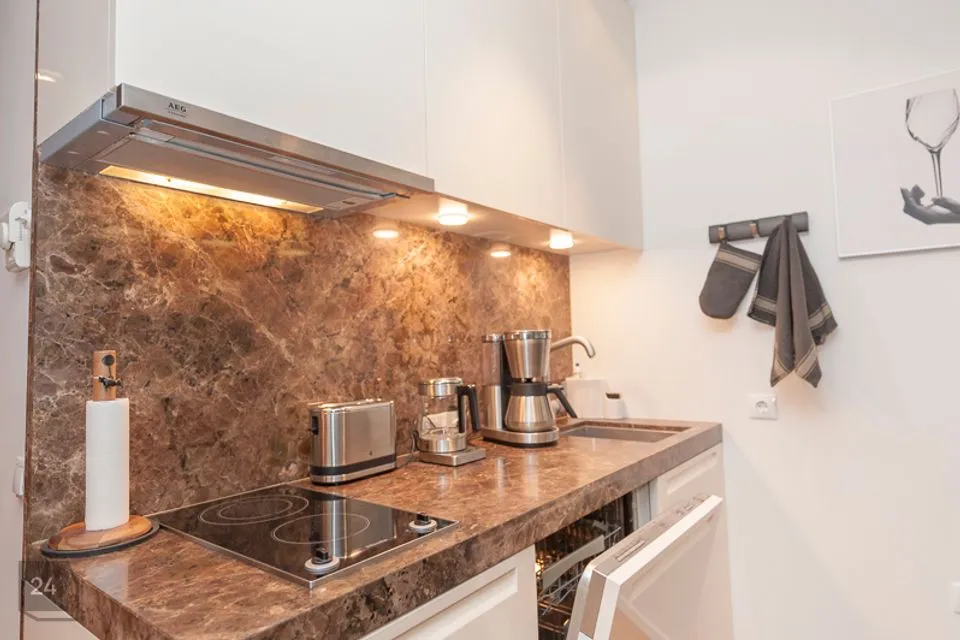 Funktsionaalsesse köögimööblisse on integreeritud kvaliteetne köögitehnika: nõudepesumasin, keraamiline pliit, toiduahi, õhupuhasti, külmkapp, mikrolaineahi.