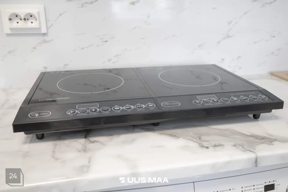 Korteris on suur külmkapp koos sügavkülmikuga, pesumasin, kahe rauaga elektripliit ja kubu.