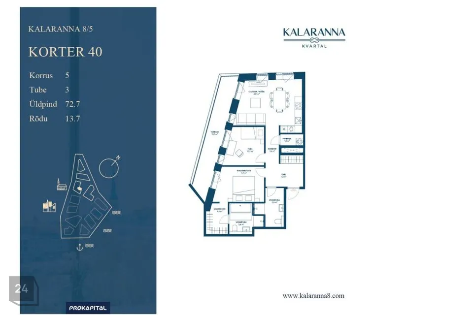Kalaranna 8/5 hoone viimasel korrusel asub unikaalsete vaadetega 3-toaline Penthouse tüüpi korter suunaga rohelisele sisehoovile ja Tallinna lahele. Korteris on elutuba-köök, kaks magamistuba, kaks vannituba ja esik. Master-bedroomil on eraldi garderoobi ja eraldi vannituba, milles on nii dušš kui ka vann. Meravaade paistab kõikidest tubadest, rõdu on suunaga mere poole.
