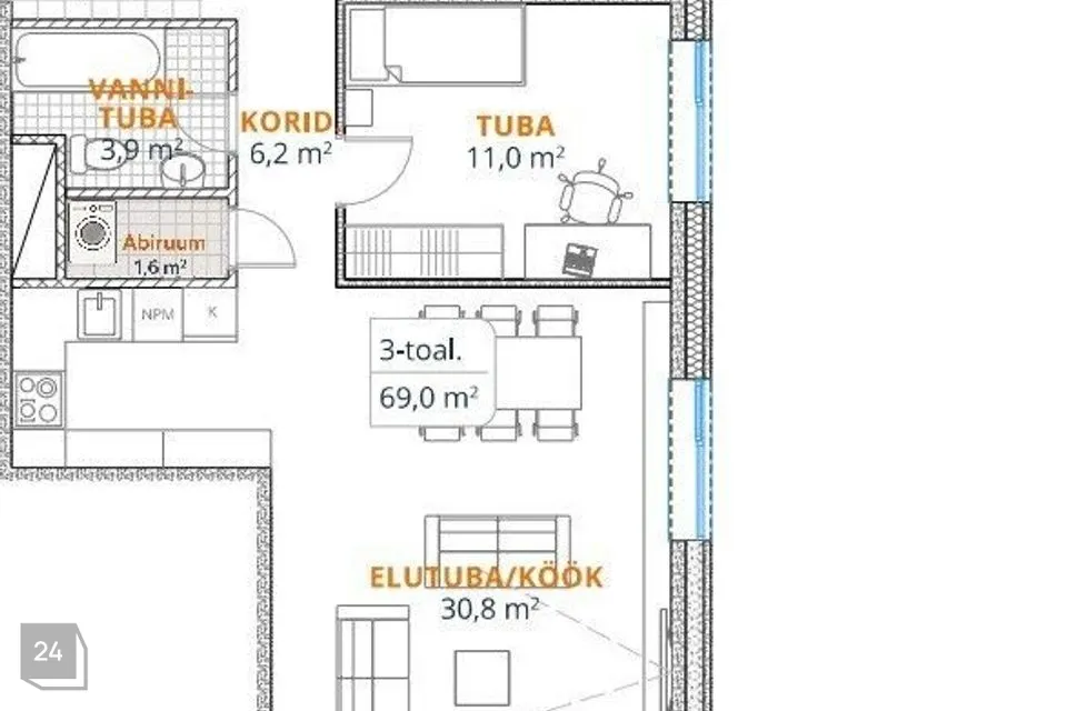 korteri üldpind on 69m2+7m2 klaasitud panoraam rõdu