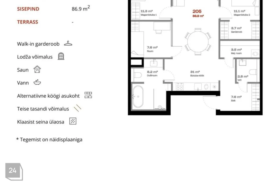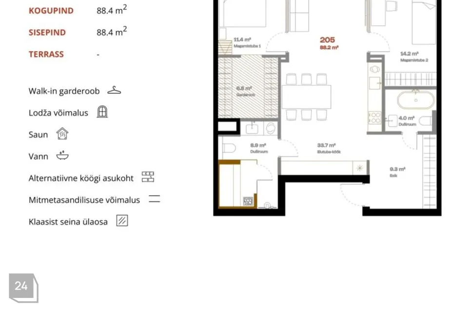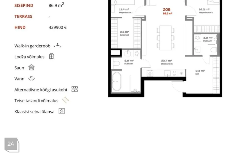 Korteri saab luua nii 3- kui 4-toalisena. Vali ise, kumb sobib paremini sinu elustiiliga! Lisatoa saab eraldada ka klaasist seintega, et säilitada rohkem valgust.