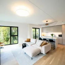 Lõunapoolses nurgapealses korteris tervitab Teid soe päevapäike ning õhtul maaliline päikeseloojang vanalinna taustal. Selle kodu keskmeks on avar ja valgusküllane elutuba, mis on sisustatud heledates toonides. Köögi ja elutoa liidab üheks köögisaar koos mahukate sahtlite ja kappidega. Tuntud köögitootja Arens on kujundanud interjööri sulanduva praktilise köögi koos integreeritud tehnikaga. Ruumile annavad iseloomu tumedate puit-alumiiniumraamidega 3-kordsed aknad ning maast laeni naturaalvalged siinidel päevakardinad. Elutoast avanevad kaks suurt ust rõdule, kus saab mõlgutada mõtted ja koguda inspiratsiooni ilusatest vaadetest ja kodusest kvartalist. Suvisel ajal on see ideaalne ruumi pikendus õue nautimaks mõnusaid suveõhtuid.