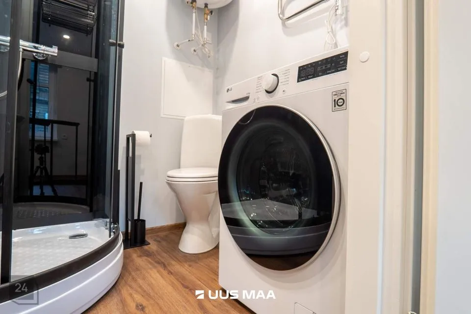 Vannitoas kaasaegne sanitaartehnika ja pesumasin.