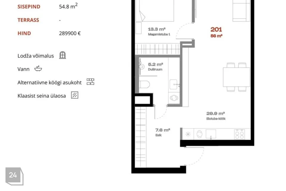 Korteri saab luua nii 2- kui 3-toalisena. Vali ise, kumb sobib paremini sinu elustiiliga! Lisatoa saab eraldada ka klaasist seintega, et säilitada rohkem valgust.