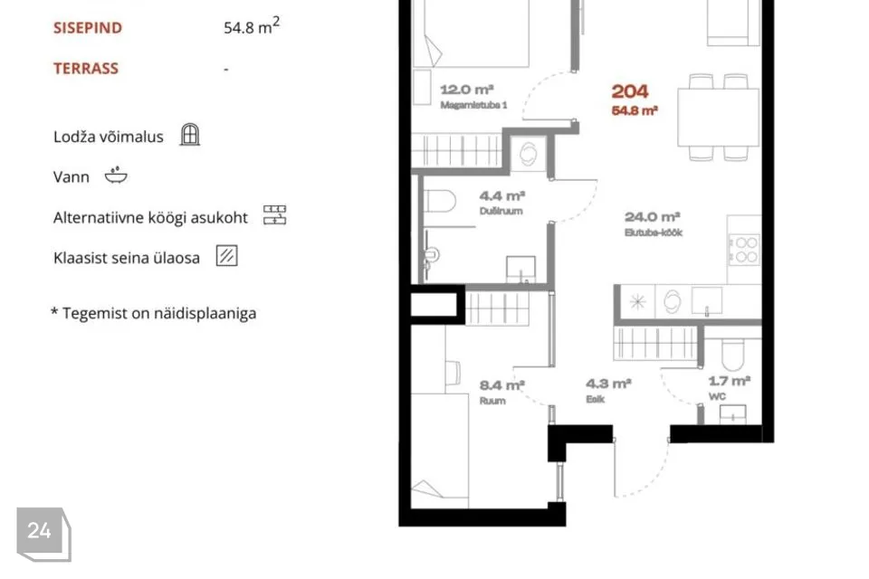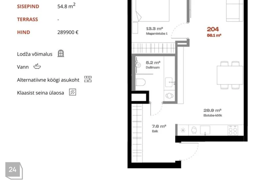 Korteri saab luua nii 2- kui 3-toalisena. Vali ise, kumb sobib paremini sinu elustiiliga! Lisatoa saab eraldada ka klaasist seintega, et säilitada rohkem valgust.