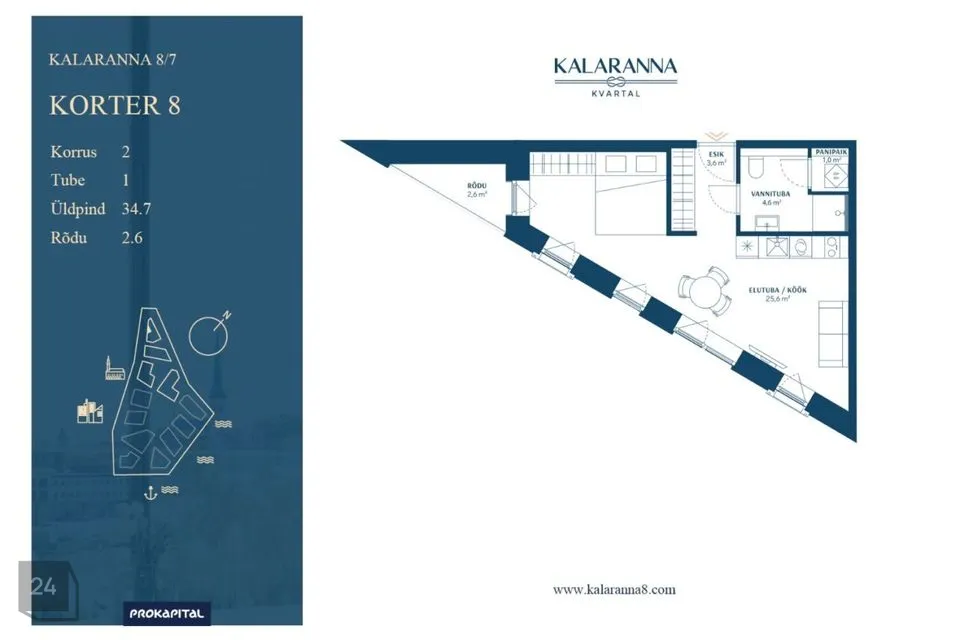 Kalaranna 8/7 hoone 2. korrusel asub hea planeeringuga stuudiokorter nr 8. Korter on 34,7m2 suurune, eraldi magamistoa osaga. Korteril on ka väike 2,6m2 suurune rõdu! Vaated avanevad vanalinna suunal, pealelõuna ja õhtupäikesele avatud. Korteri hind sisaldab siseviimistlust ja päevakardinaid.