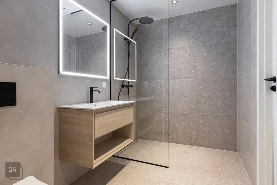 Duširuum on möbleeritud ning hinnas sisalduvad valamu, valamukapp ja valgustusega peegel.