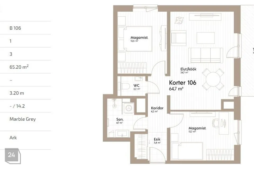 Kõrgete lagedega (3,2m) korteriomandis paiknevad kõik toad eraldi. Dušširuumis on Duraviti mööbel ja peegel, paigaldatud on ripplae valgustid. Wc valamu ja peegiga on eraldi ruumis. Elutoast saab sisehoovi suunas avatud terrassile.