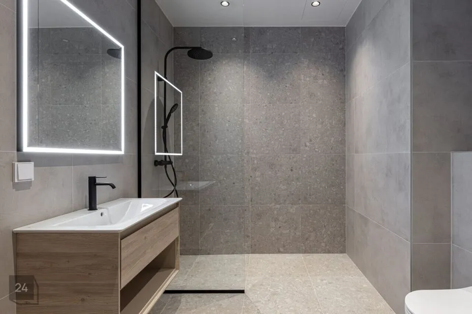Duširuum on möbleeritud ning hinnas sisalduvad valamu, valamukapp ja valgustusega peegel.