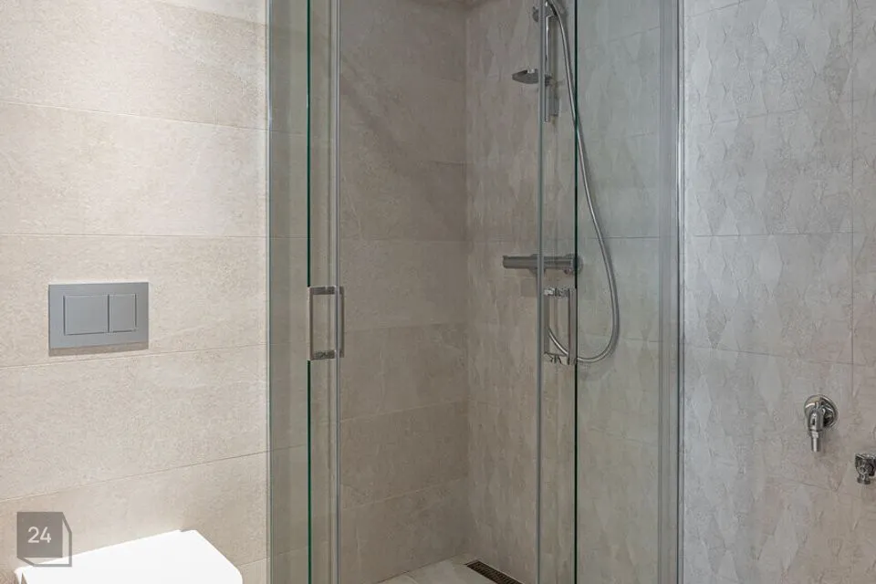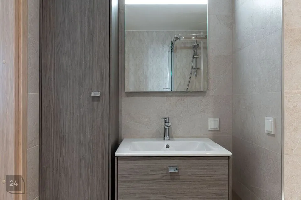 Esikus on avar nish garderoobikapi jaoks. Duširuum on möbleeritud Duraviti mööbliga. Korteri hinnas sisaldub nii valamu, valamukapp, seinakapp kui ka juba paigaldatud valgustusega peegel. Segistid on kroomitud, Hansgrohelt.