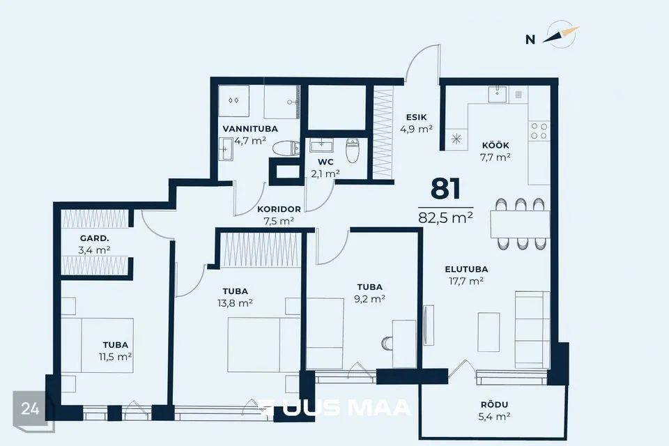 Korteris on 3 magamistuba, avar elutuba koos köögiga, vannituba, WC, rõdu