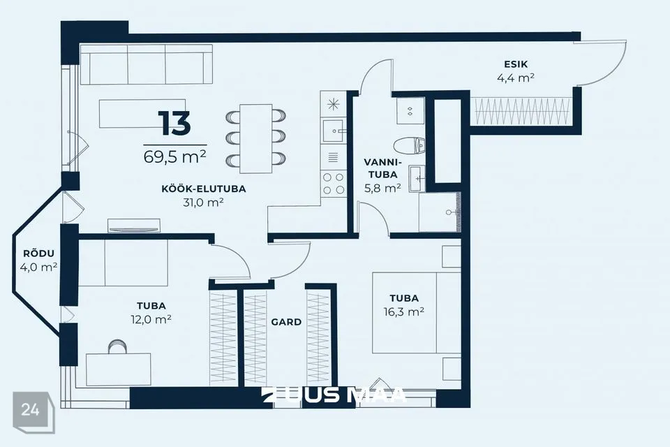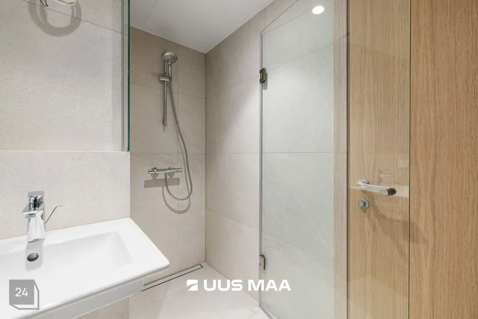 Selles korteris on Classy viimistluse paket. Kalasaba Off+white tamme parket, spoonist siseuksed, vannitoas ja esikus on kasutatud plaat Refin Tune snow. Sanitaartehnika Villeroy & Boch ja Hansgrohe segistid.