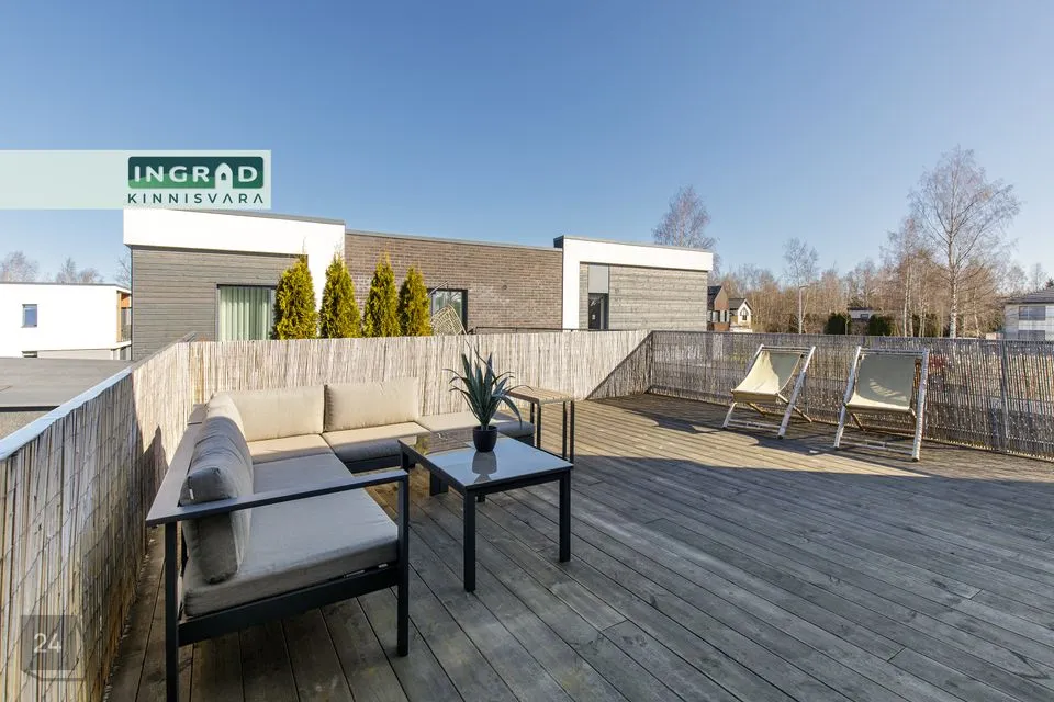 Katusekorrusel avar päikeseterrass, kust avaneb vaade rahulikule ümbrusele.