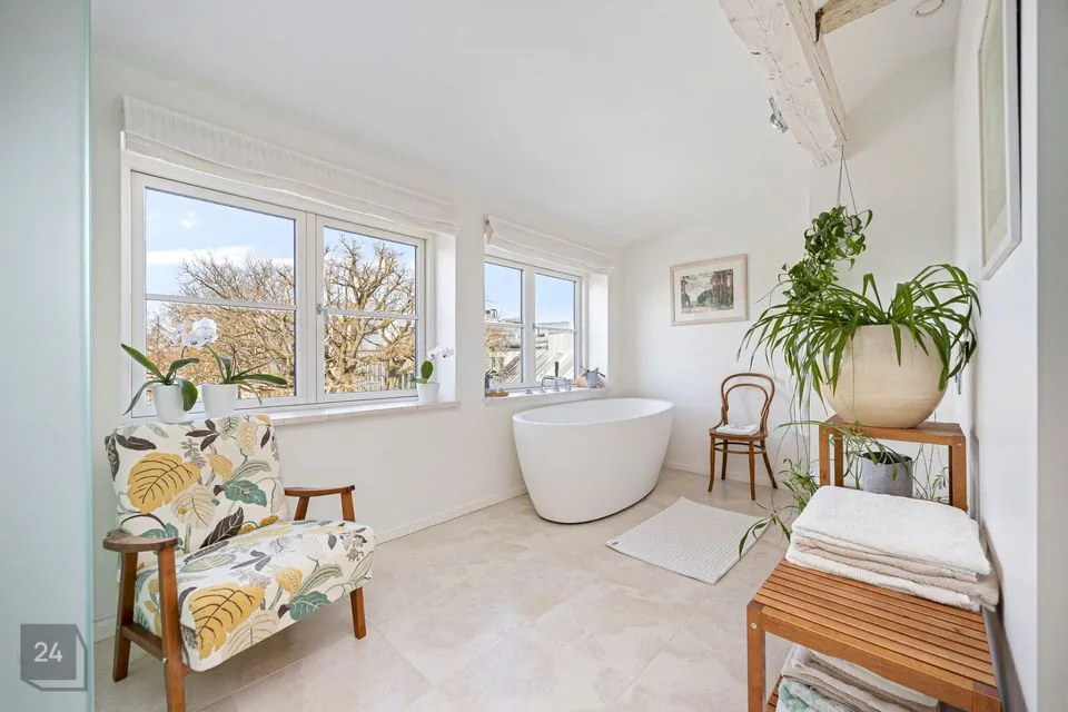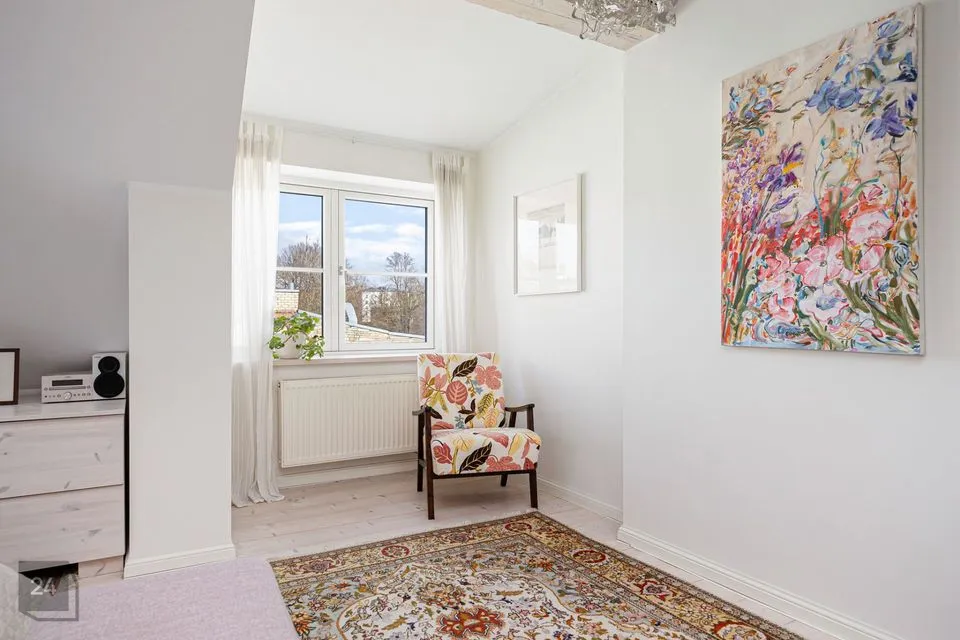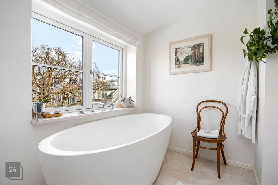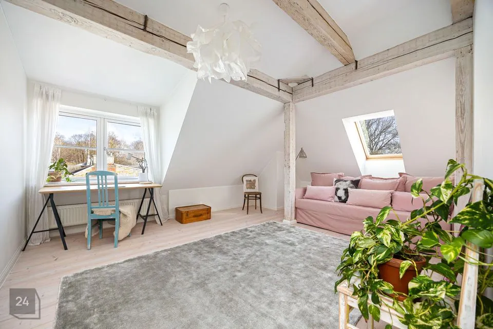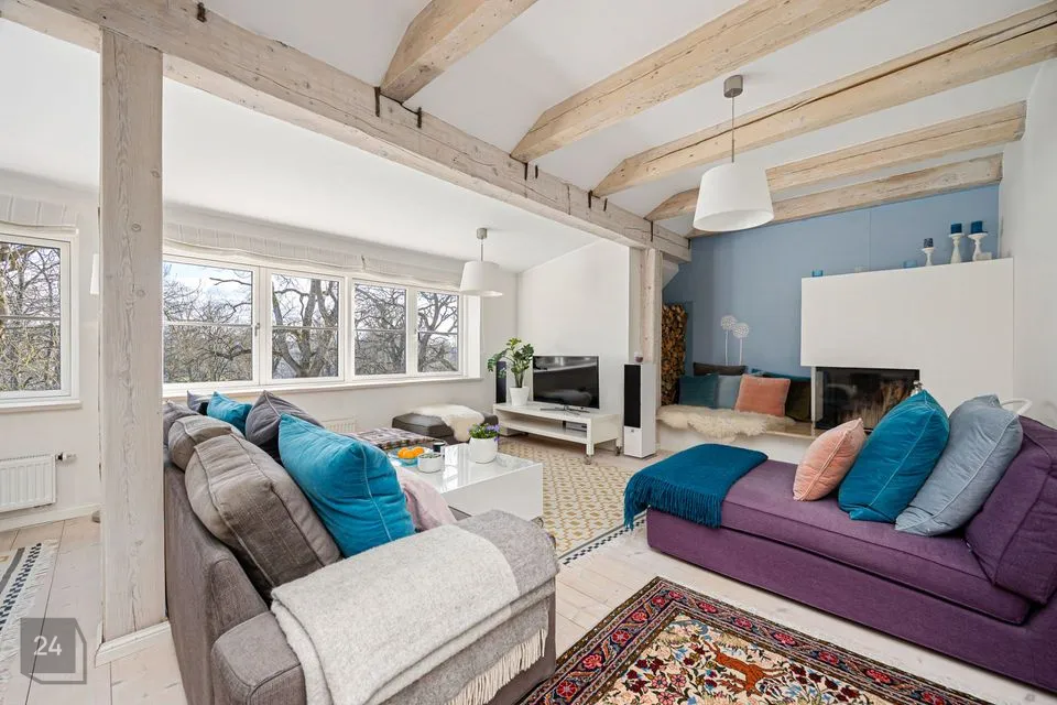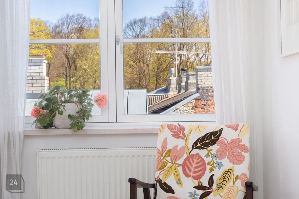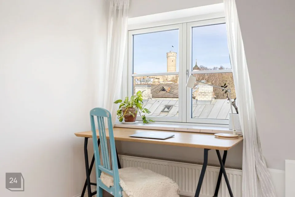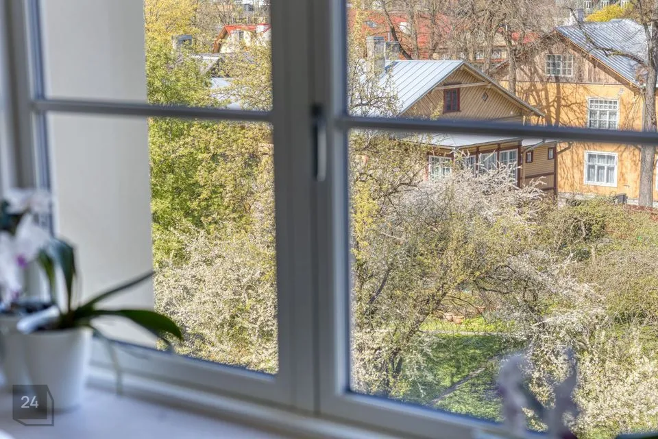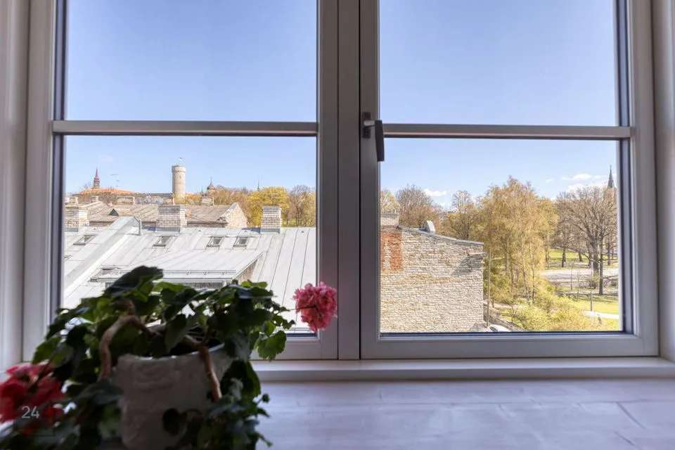 Müüdav korter paikneb elamu viimasel korrusel, hõlmates pool korrust ning akendest avanevad ilusad vaated kolme suunda - näha on vanalinna ja kirikuid, kauneid ajaloolisi maju oma aedadega ning elutoast avaneb vaade pargi rohelusele.
