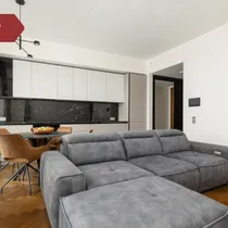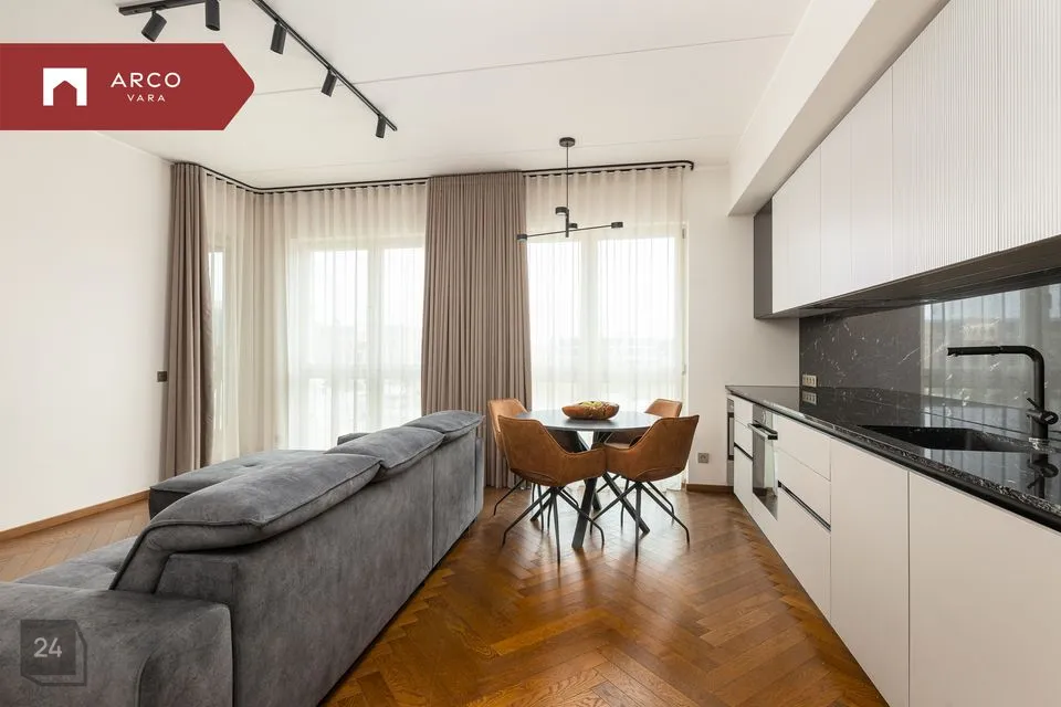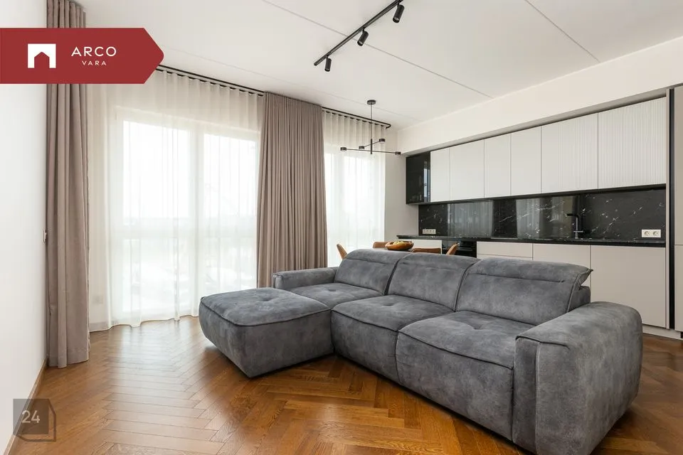 Korteri kõrged aknad toovad tuppa rohkelt loomulikku valgust ja loovad avara, õhulise tunde kogu elamispinnas.
