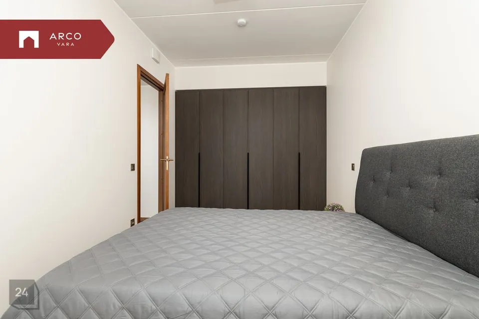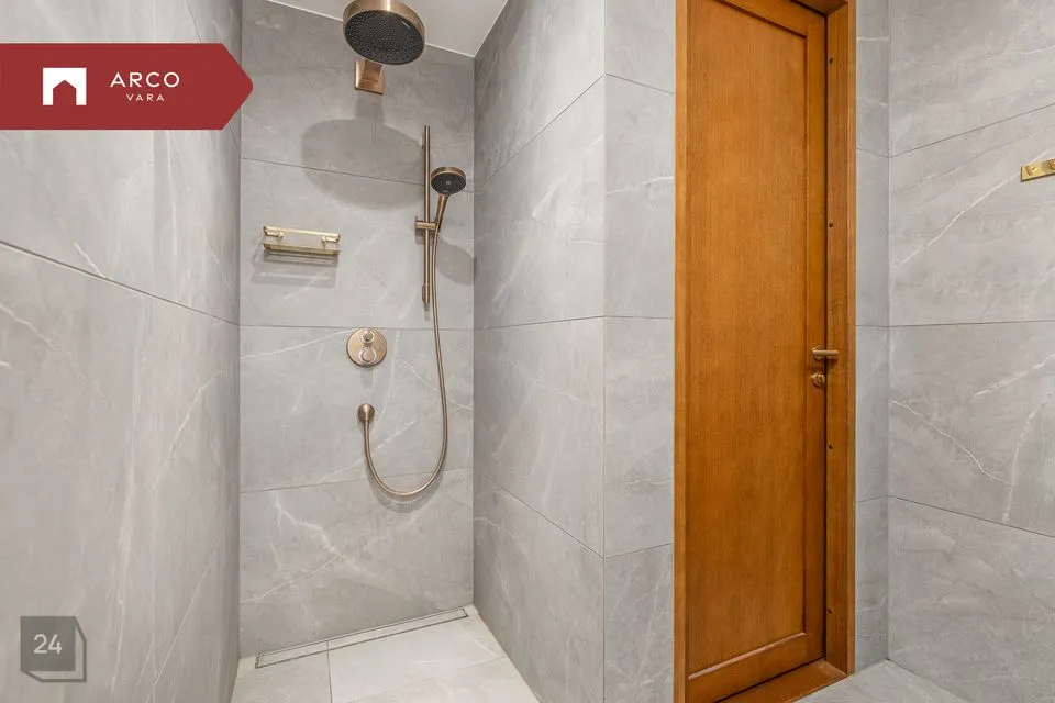 Vannituba on kaasaegse viimistlusega: seintel ja põrandal suured keraamilised plaadid, kvaliteetne santehnika ning lisamugavust pakkuvad Duravit valamualune kapp ja peegel. Santehnika kuulub Hansgrohe harjatud messingist seeriasse, mis rõhutab üldist luksuslikku joont.