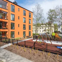 Kinnistu lõunapoolsel küljel on hubaselt valgustatud, haljastatud ja aiaga piiratud õueala, kuhu on rajatud lastele mängulinnak koos kiige ja liivakastiga ning lauad ja istumispingid täiskasvanutele. Kogu kinnistu haljastus on sobitatud olemasolevasse kõrghaljastusse ja nii on loodud loomulik, looduslähedane ja väikelinnalik miljöö.