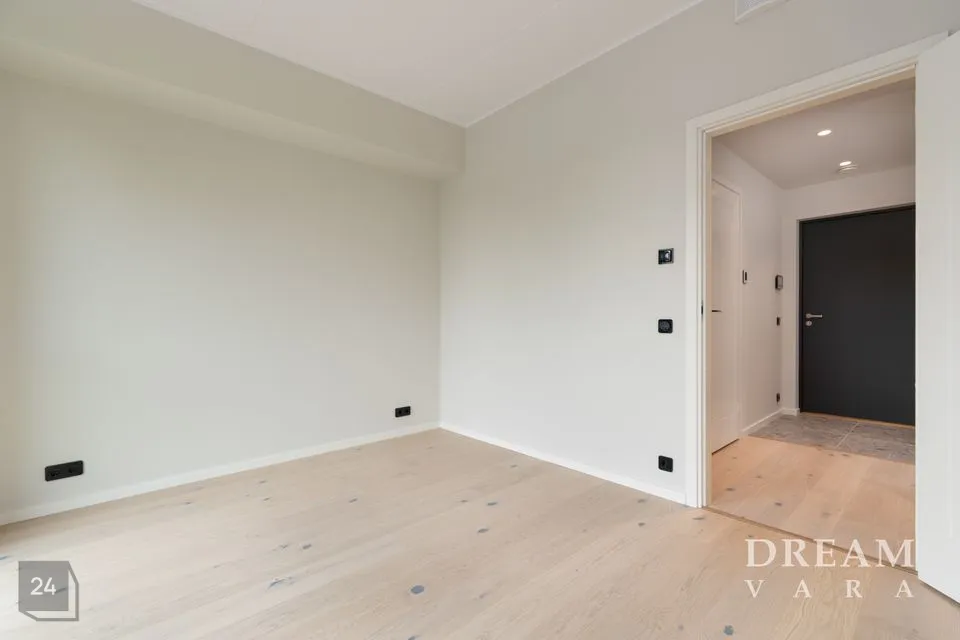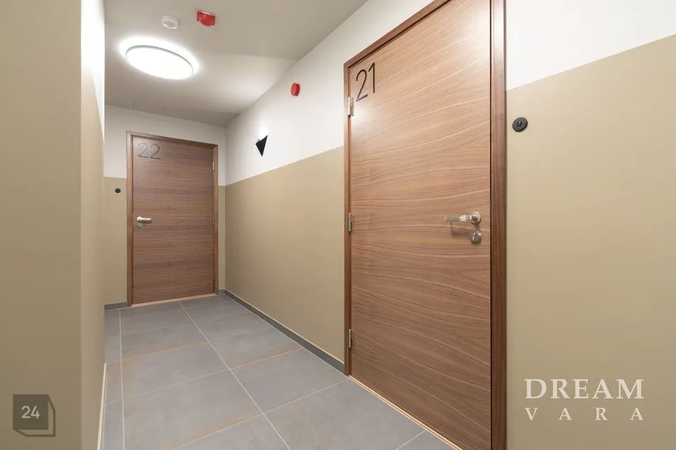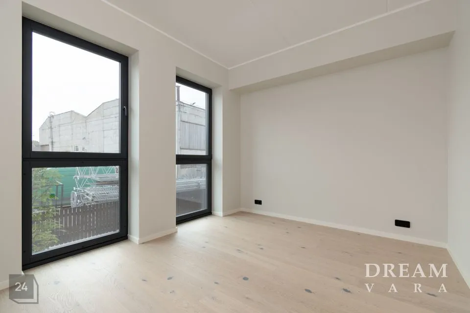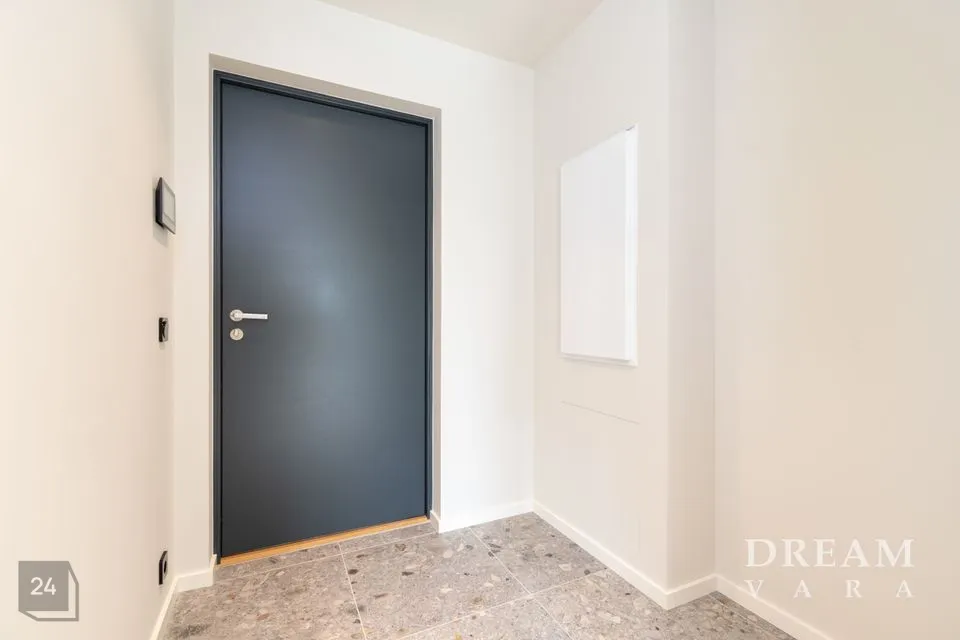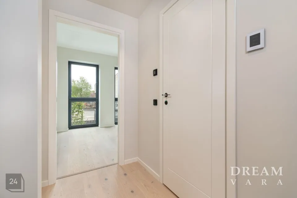 Põrandaid katab naturaalne tammeparkett koos valgete põrandaliistudega. Vannitoas on põrandal ja seintel halli tooni keraamilised plaadid. Korteris on valged siseuksed ja musta raamiga puit/alumiinium aknad.
