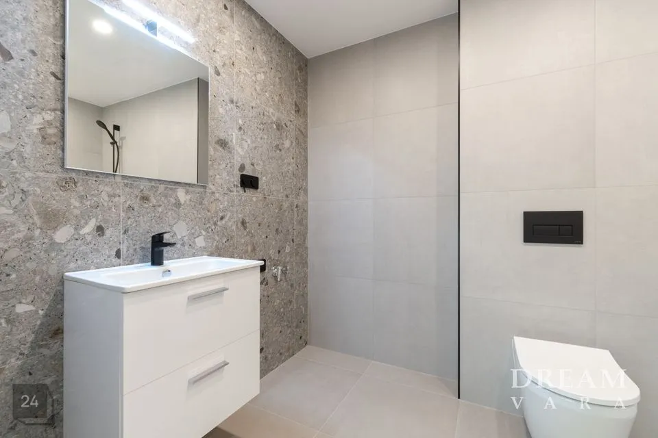 Vannituppa on paigaldatud valge valamukapp ning seinale peegel koos valgustusega.