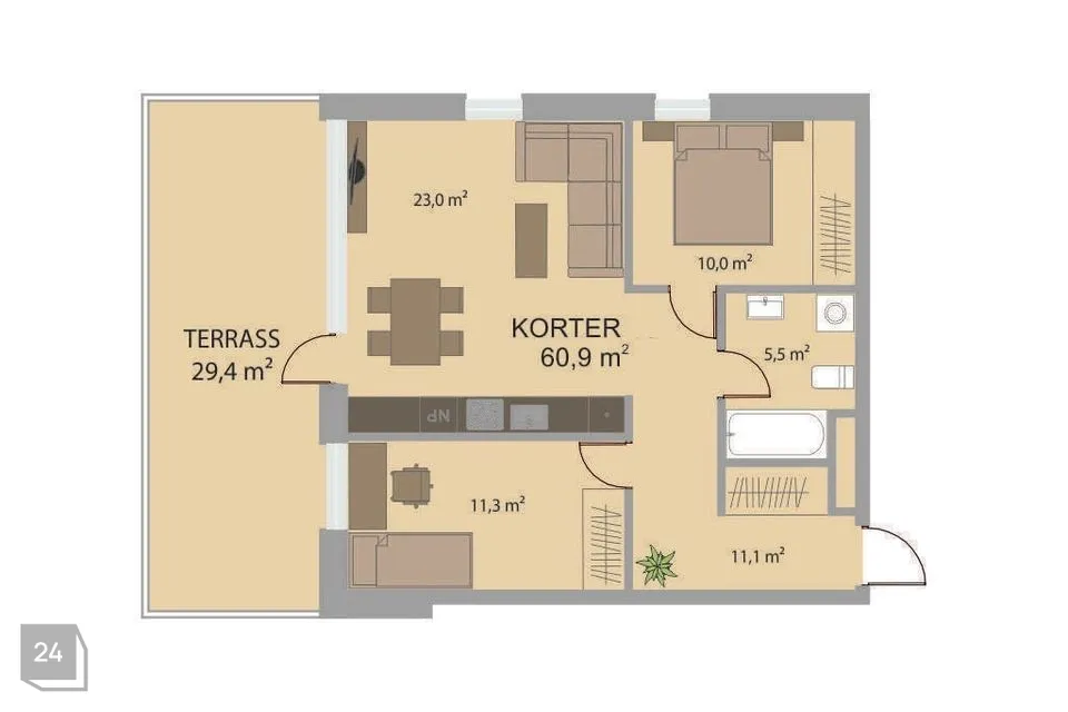 Korteri kogu üldpind on 90.3m² mis koosneb 60.9m² suurusest köetavast pinnast ja 29.4m² suurusest terrassialast - selle koosseisu kuuluvad: mahuka garderoobiga esik, elutuba koos avatud köögiga, kaks magamistuba, WC/vannituba ning avar terrassiala.