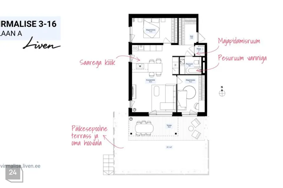 See tore 3-toaline kodu asub maja 1. korrusel. Suur terrass (18.3 m2) ja oma hooviala (37.1 m2) teevad sellest eriti mõnusa koha kesklinnas kõrguvas roheluses ja helisevas linnulaulus. Kaks magamistuba, eraldi majapidamisruum, pesuruum duši või vanniga, köök saarega. Elutuba-köök on mõnusalt avar ning kodu on kõrgete lagede, uste ja akendega.