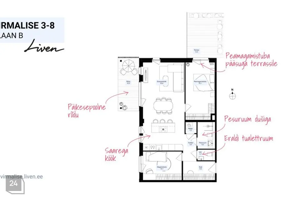 See hubane 3-toaline rõdu ja terrassiga kodu asub Virmalise maja 2. korrusel. Elutuba-köök on mõnusalt avar ja valgusküllane ning eluruume pikendavad välialad. Kodus on kõrged laed, kaks magamistuba, eraldi majapidamisruum, saarega köök, walk-in garderoob, pesuruum duši või vanniga, või hoopis saun või eraldi tualettruum – Sinu valik.