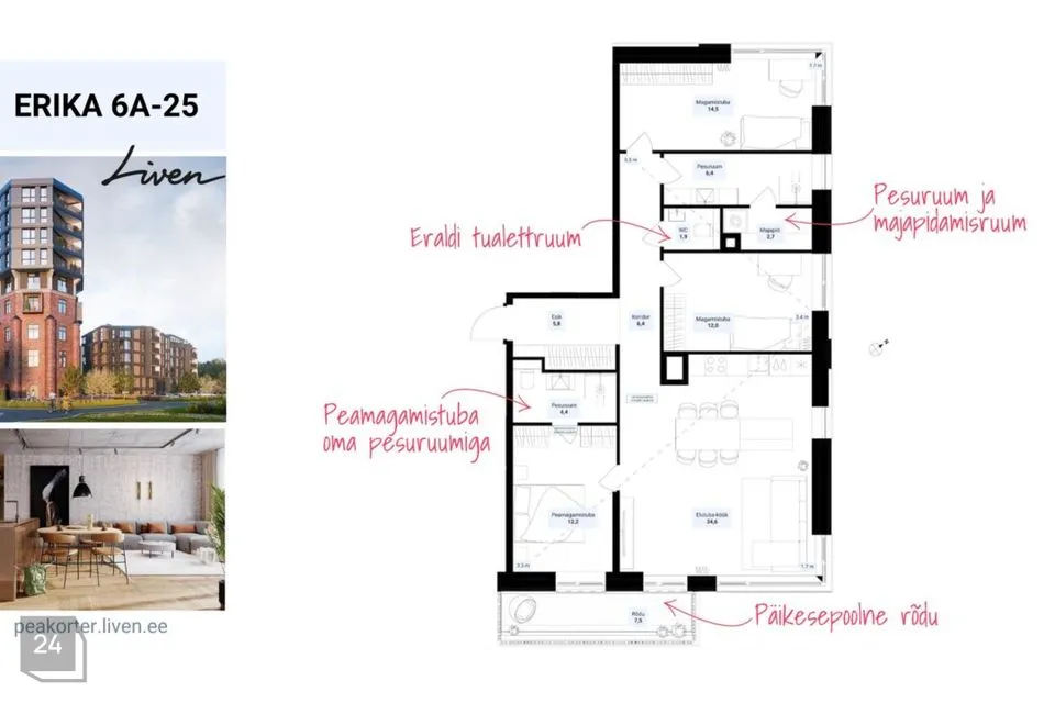 See neljatoaline nurgapealne Peakorteri kodu asub A-maja 6. ehk viimasel korrusel. Kolm magamistuba, millest peamisel eraldi pesuruum, lisaks suur pesuruum duši ja eraldi majapidamisruumiga, tualettruum ning avar ja hubane elutuba-köök pääsuga rõdule. Kõrged kaldlaed ning suured aknad ja uksed annavad koju palju valgust ja avarust.
