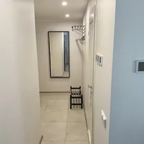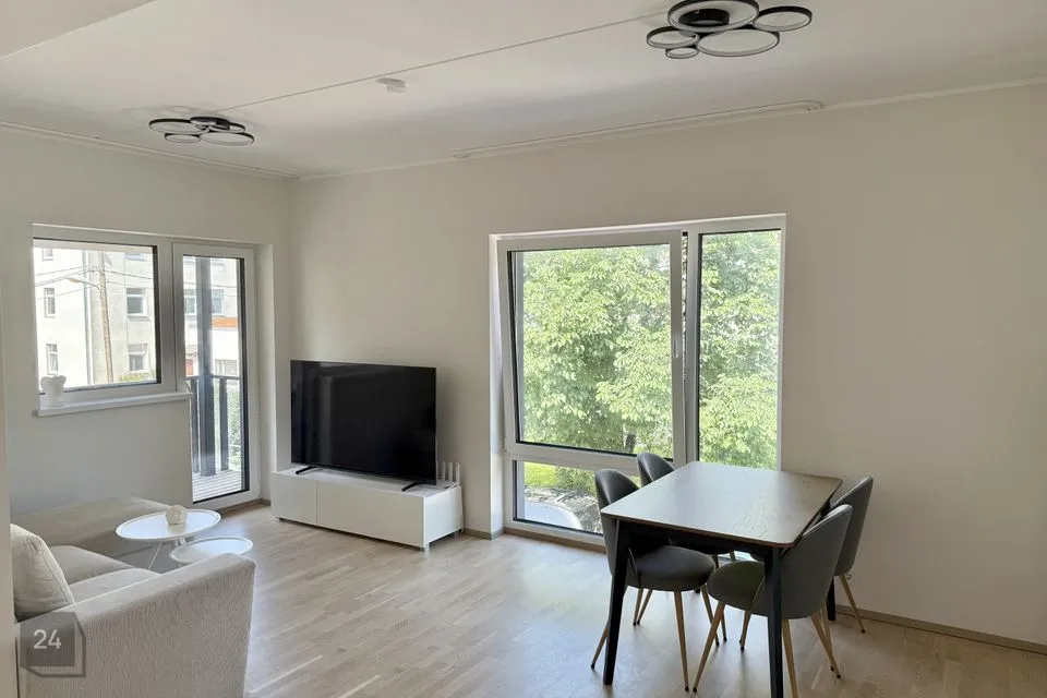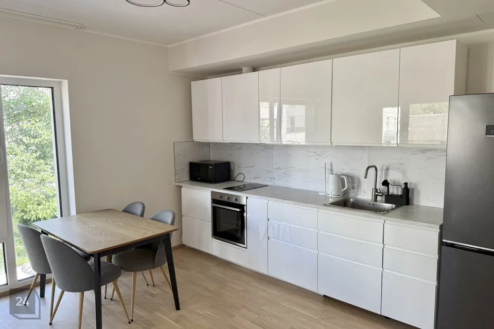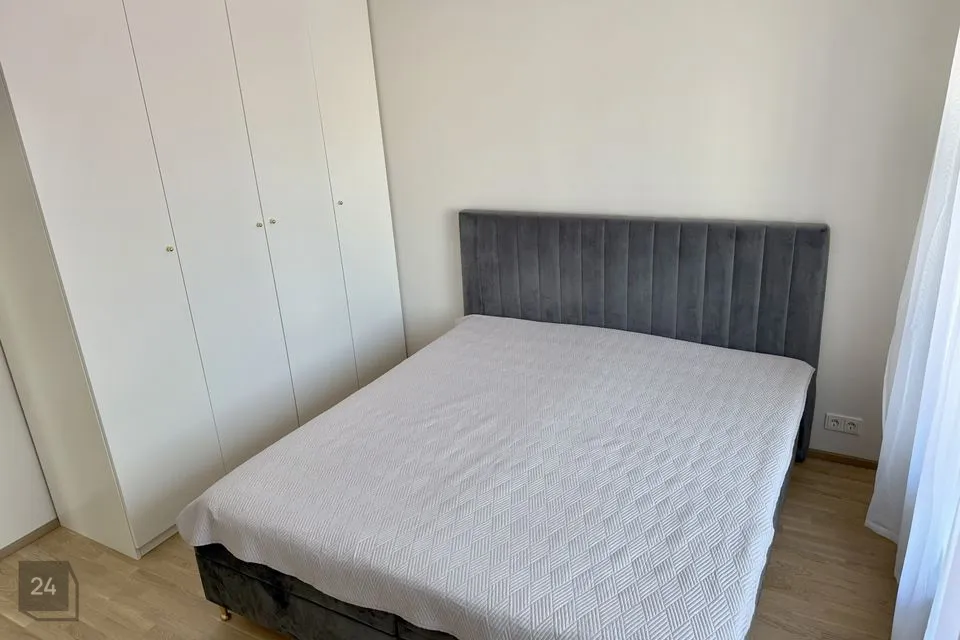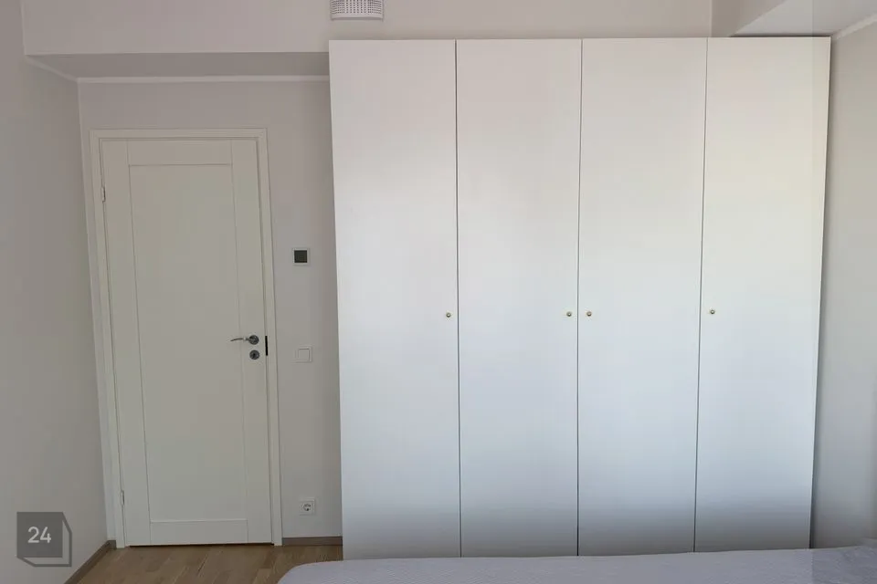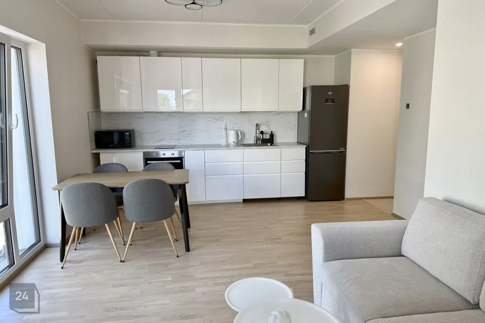 The apartment has water underfloor heating and heat-recovery ventilation, ensuring a pleasant indoor climate and energy efficiency all year round. The sale price includes built-in furniture and appliances: a stove, oven, and refrigerator in the kitchen; a sofa and TV stand in the living room; and a large bed, wardrobe, and makeup table in the bedroom.