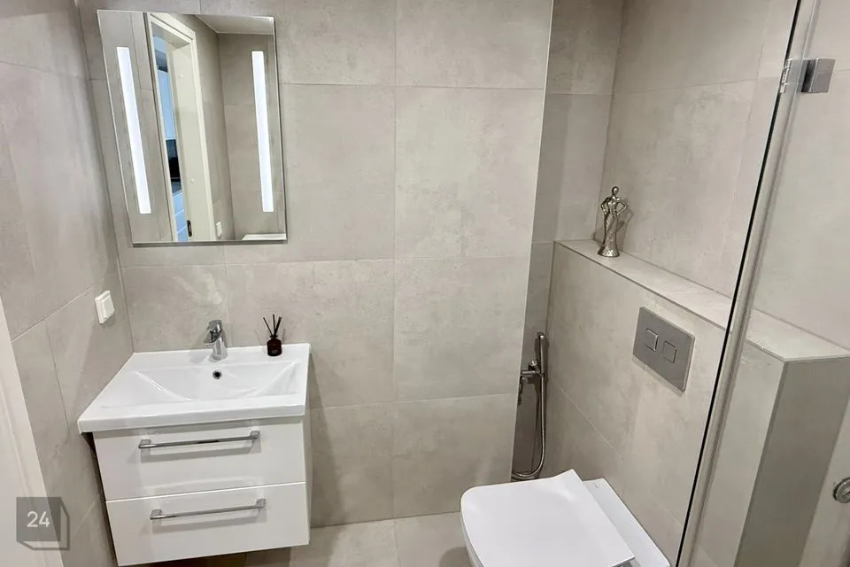 A spacious and bright two-room apartment is located on the second floor of the building and offers a comfortable and functional layout. The 22.3 m² open-plan living room with kitchen is the heart of the home — there is enough space for a dining table as well as a cozy lounge area for spending time with family and friends. The bedroom (12.3 m²) is private and quiet, and the bathroom (3.8 m²) is modern and finished with high-quality materials, including an LED mirror and a comfortable shower corner.