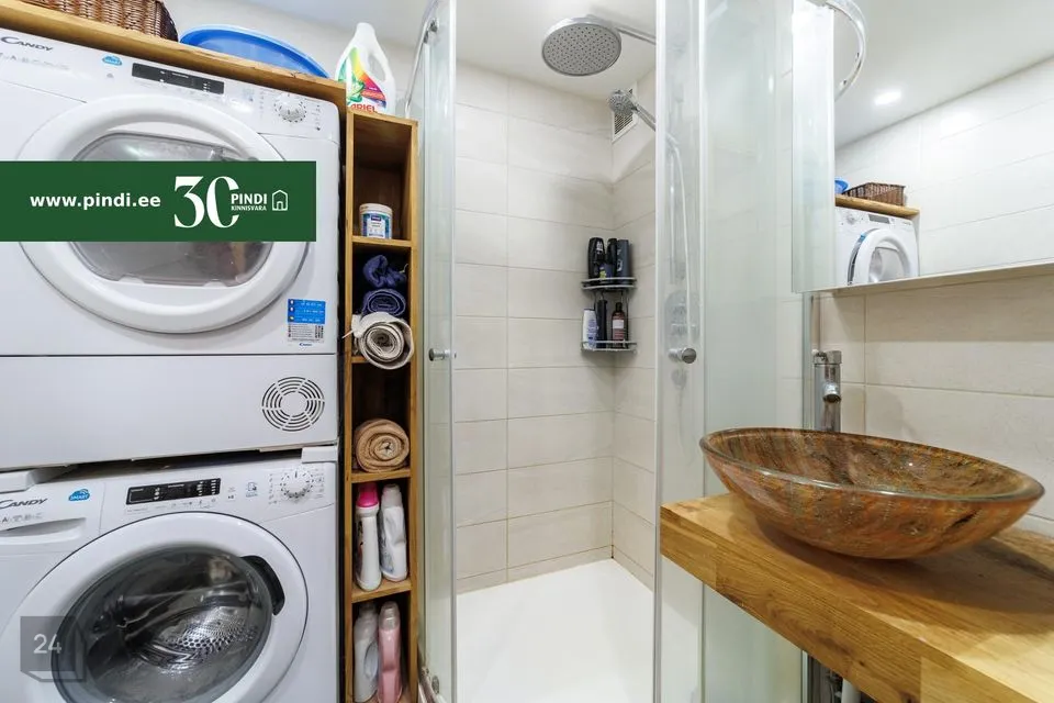 Eraldi asetsevas duširuumis on dušinurk ning pesumasin ja kuivati. Wc paikneb eraldi ruumis. San.ruumide põrandatel on kiviplaatkate, mujal korteris on laminaatpõrand.