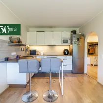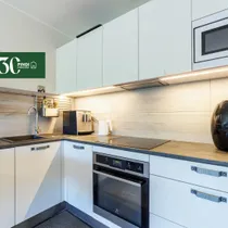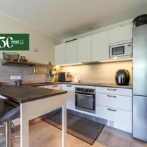 Köögis on Arensi valge köögimööbel koos köögisaare ja kahe baaritooliga ning köögitehnika: nõudepesumasin, induktsioonpliidiplaat, küpsetusahi, õhupuhasti (filter), külmkapp sügavkülmikuga ja mikrolaineahi.