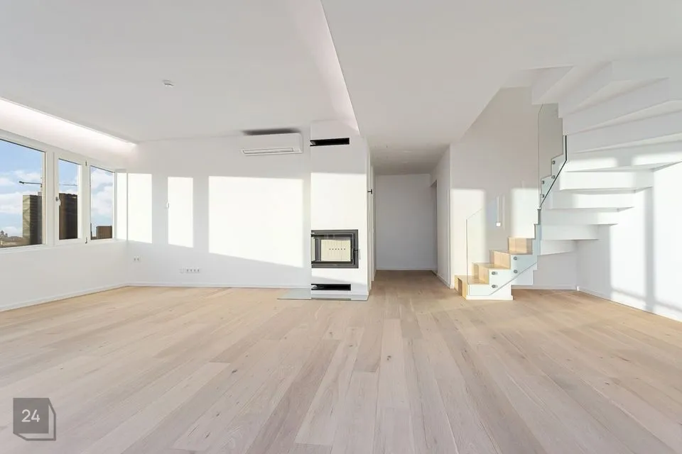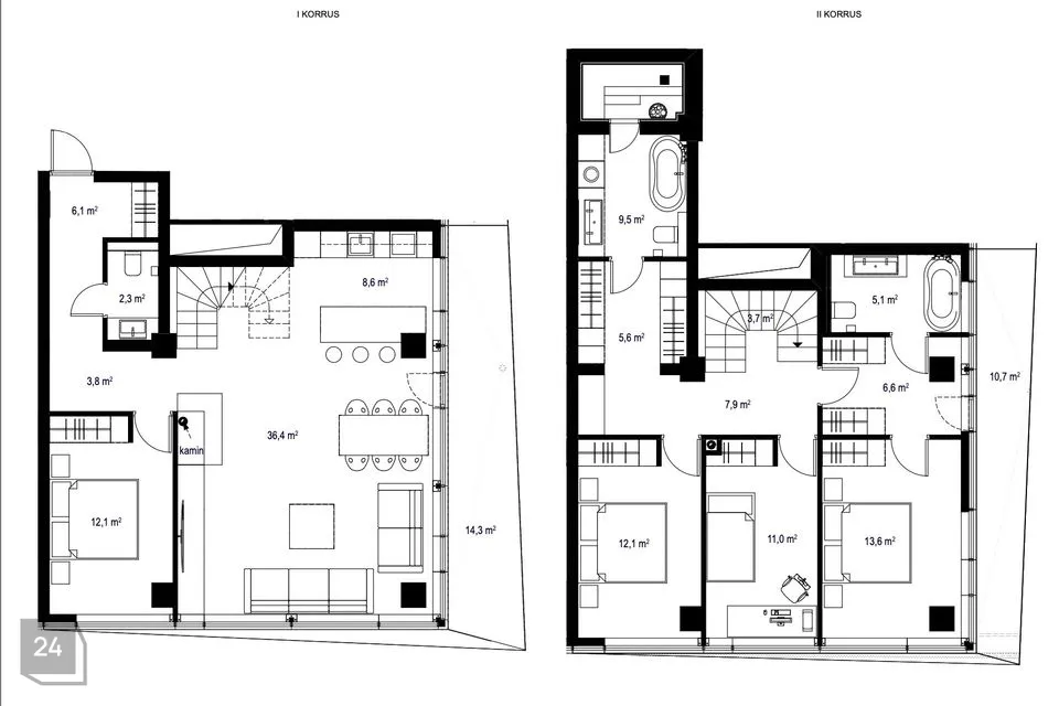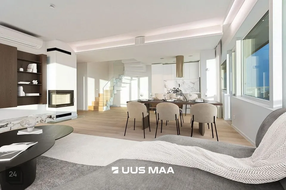 Esimesel korrusel on kaminaga, suur avatud köögiga elutuba, üks kahest suurest rõdust, külalistetuba ja tualettruum.