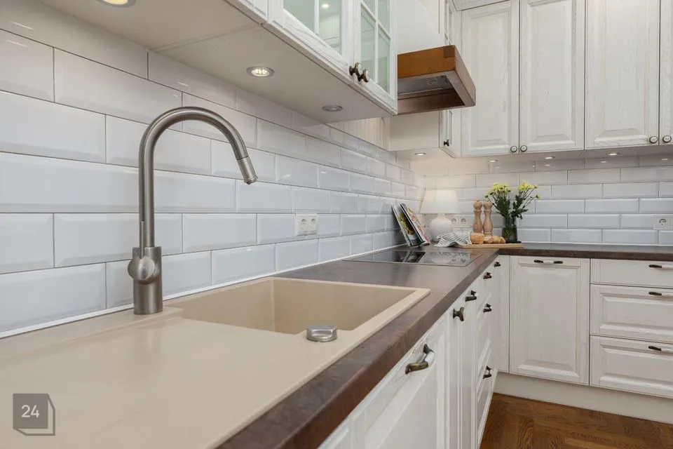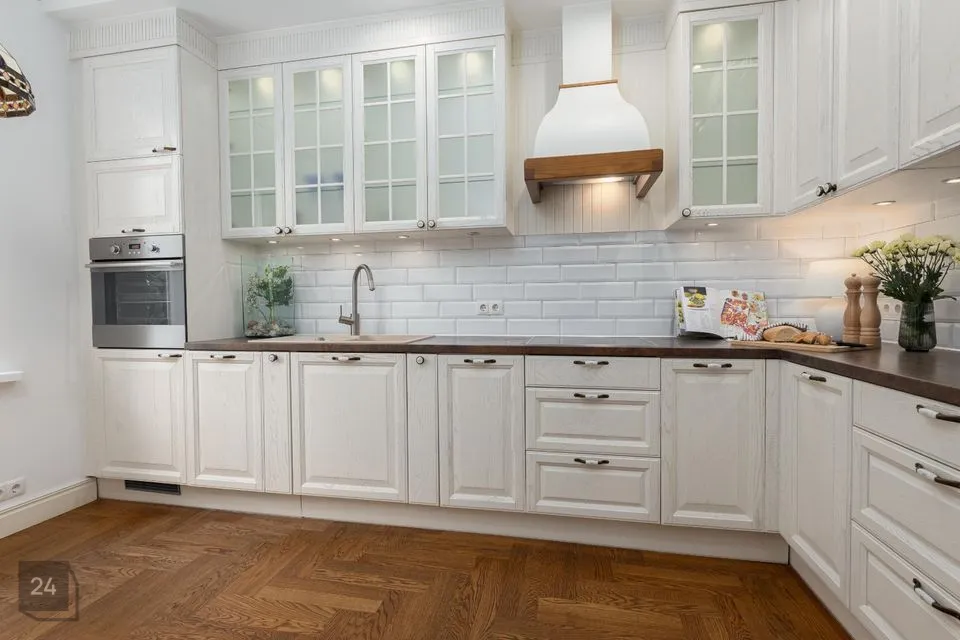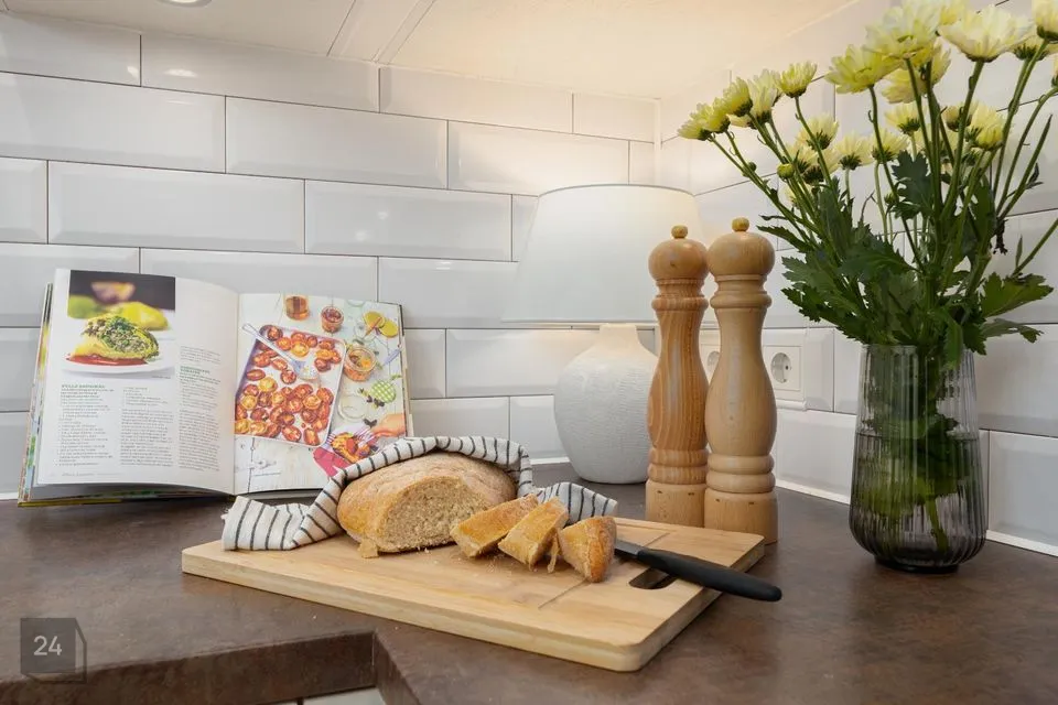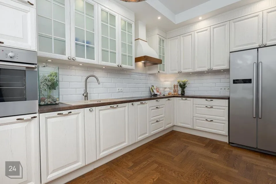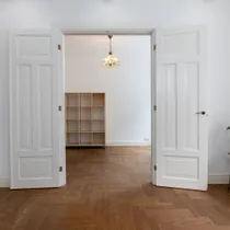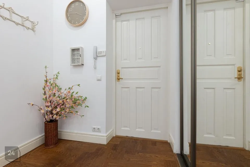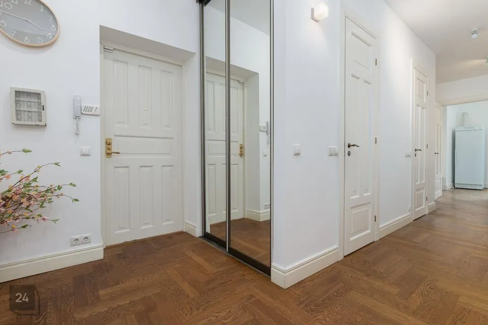 Korteris on kõrged laed, mis annavad ruumidele elegantsi ja avarust ning eritellimusel valminud tavamõõtudest kõrgemad valged puidust uksed. Põrandaid katab tammepuidust pööratud topeltkalasaba mustriga õlitatud parkett (lakki ei ole kasutatud), mis lisab ruumile luksuslikku ilmet ja hubasust ning on palja jala all erakordselt mõnus astuda. Interjööris on kasutatud laiu valgeid puitliiste, mille disain on inspireeritud Rootsi luksuslikust sisekujundusest.