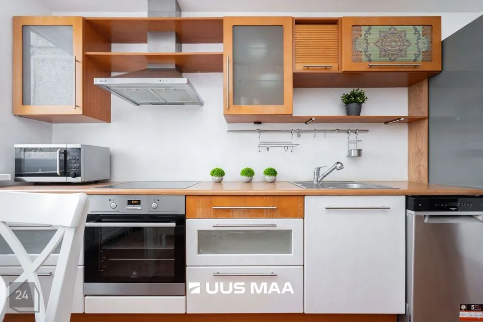 Täielikult sisustatud köök on varustatud kõige vajalikuga – köögimööbel, keraamiline pliit, ahi, kubu, nõudepesumasin ja külmkapp. Lisaks on olemas ka mugav söögilaud ja toolid. Magamistubadesse jäävad mahukad riidekapid, mis tagavad panipaigaruumi.