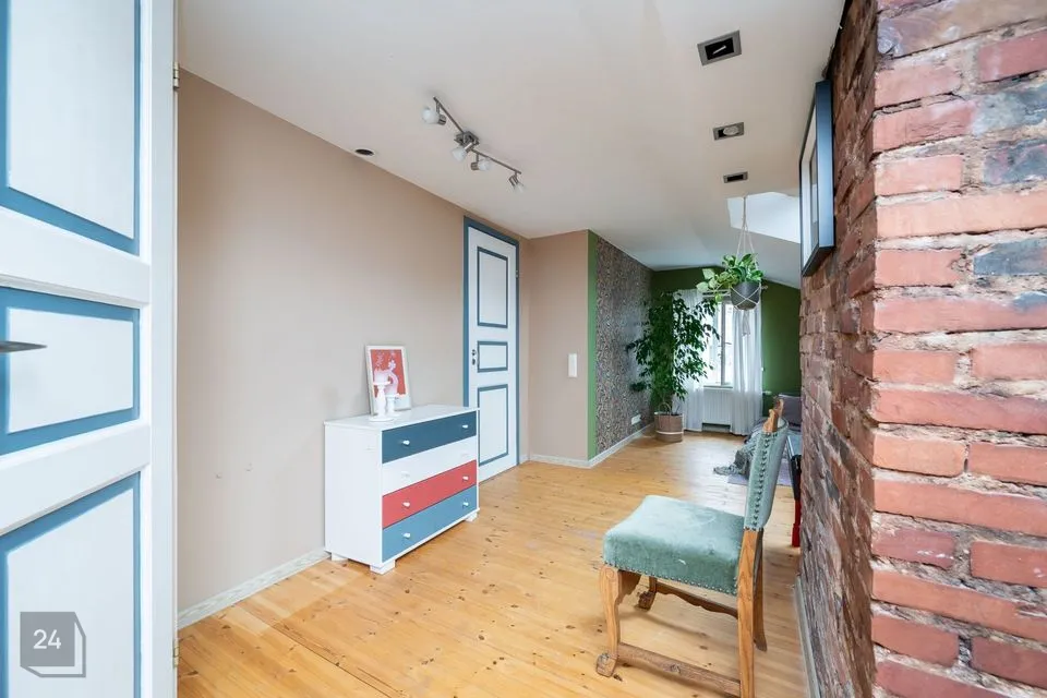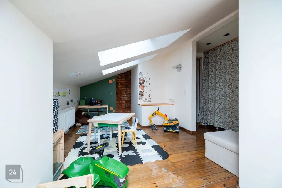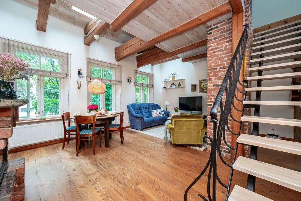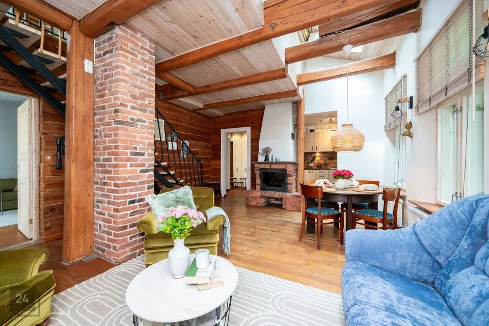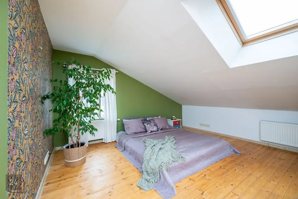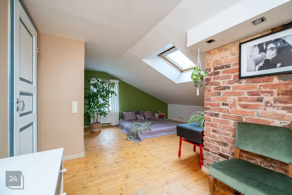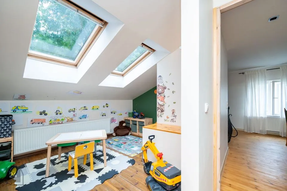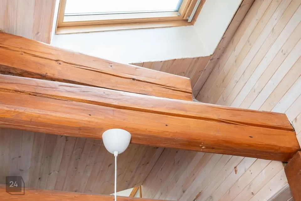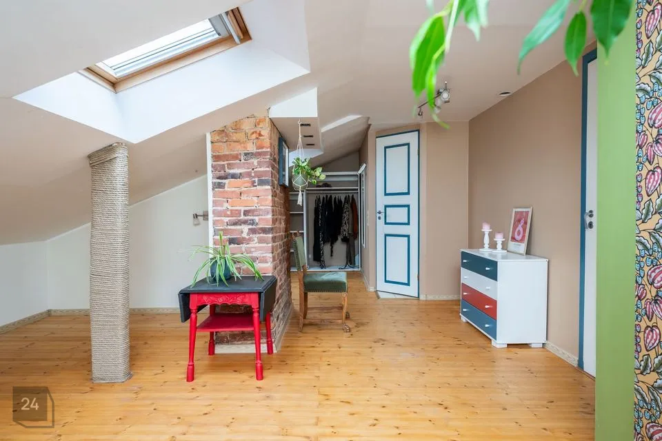 Iseloomu ja avarust lisavad korterile puittalad ja katuseaknad. Põrandaid katab puitlaud, mis on jala all väga soe ja pehme.