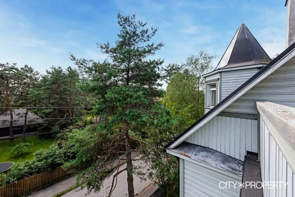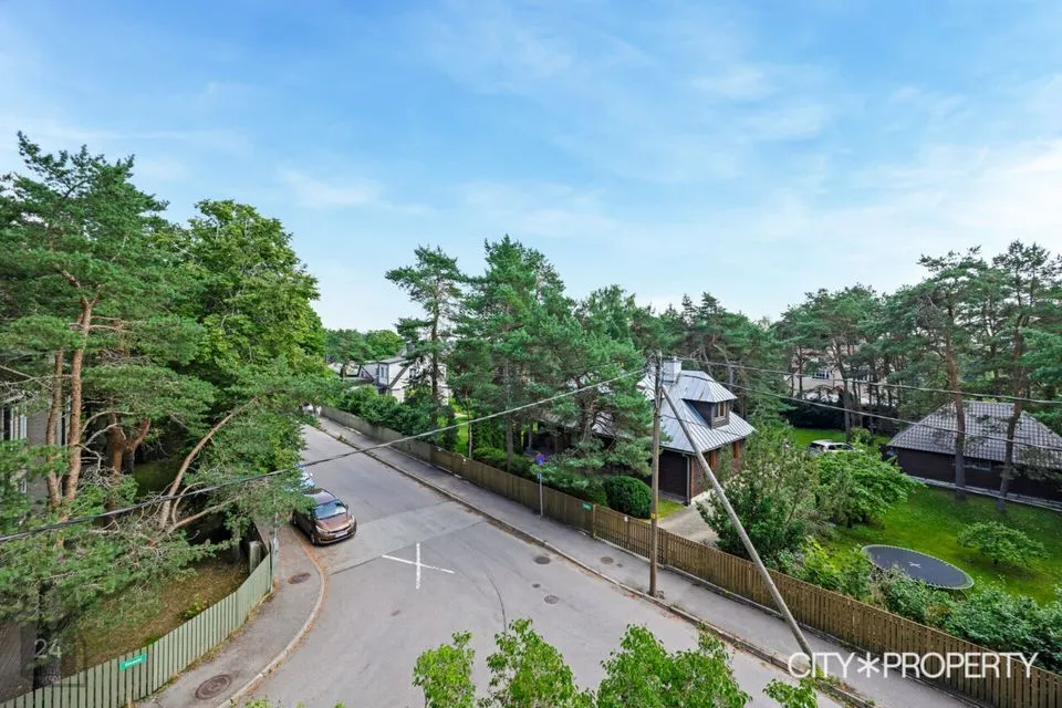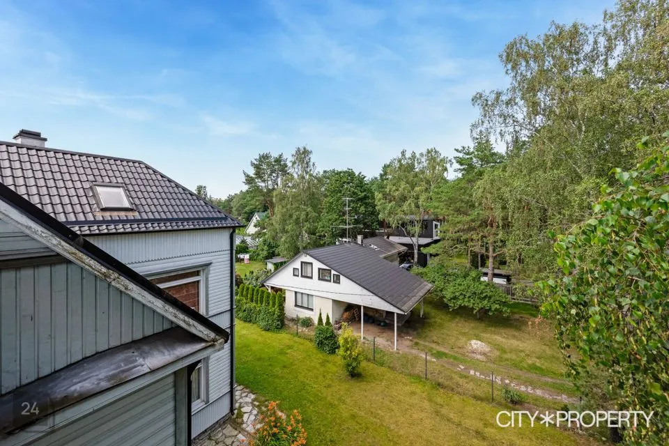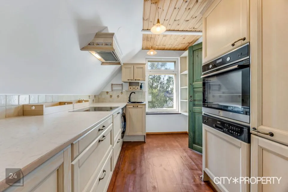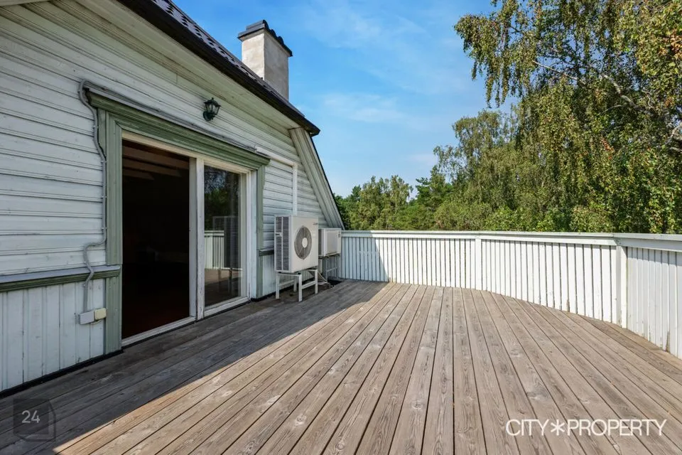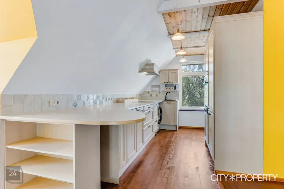 Pääsküla rahulikul vahetänaval, eestiaegse maja katusekorrusel asub hea potentsiaaliga, suur kahetoaline korter. Maja on tervikuna renoveeritud umbes 20 aasta eest ja samasse perioodi jääb ka müüdava korteri väljaehitamine ning siseviimistlus. Korteri planeering on lihtsalt muudetav kolmetoaliseks, kui torniga ärklituba vaheseinaga eraldada. Hetkel moodustavad elupinna kõrge kaldlaega elutuba koos avatud köögiga ning magamistuba. Eluruumi kahepoolsed otsauksed saab avada mõnusale suurele terrassile (23m2), kuhu paistab hommiku ning keskpäeva päike. Lisaks asub elutoas ka mahukas panipaik, kuhu on paigaldatud pesumasin.