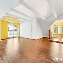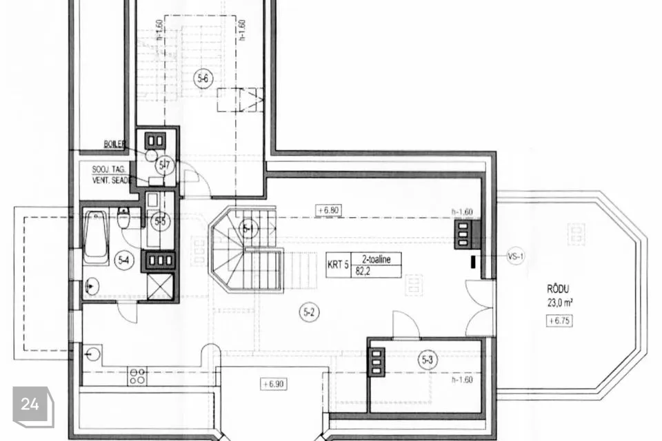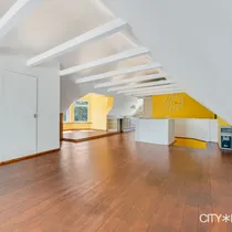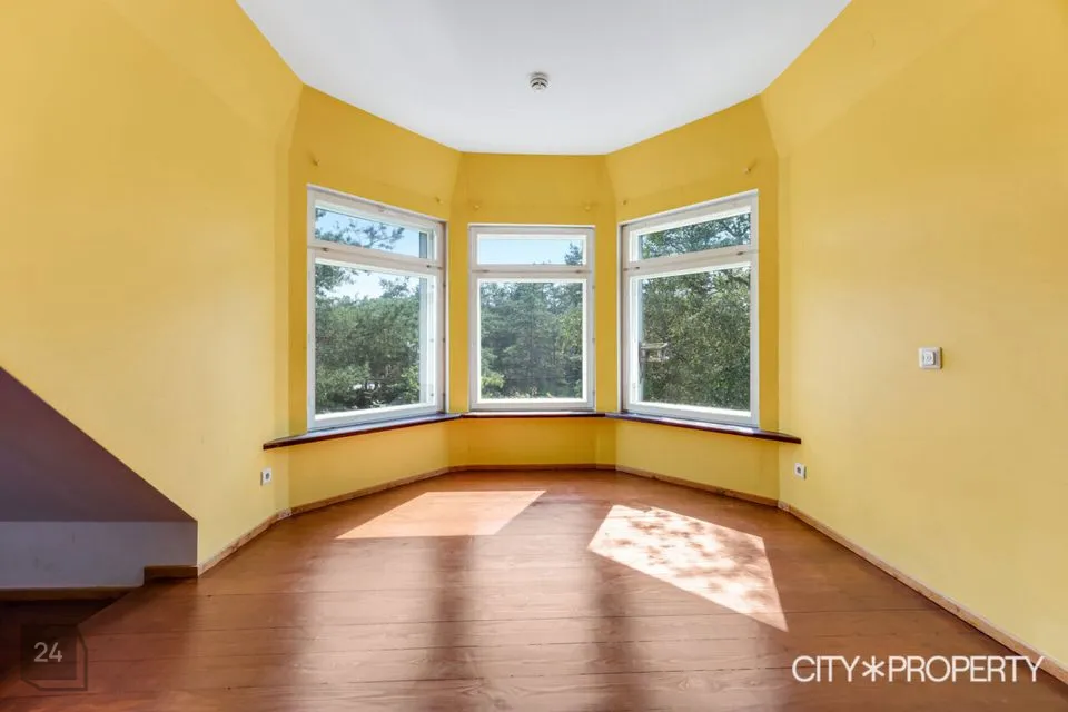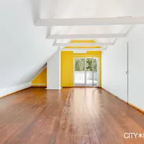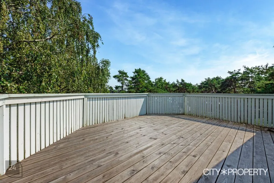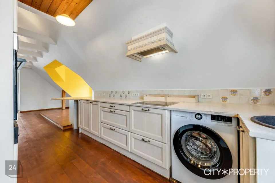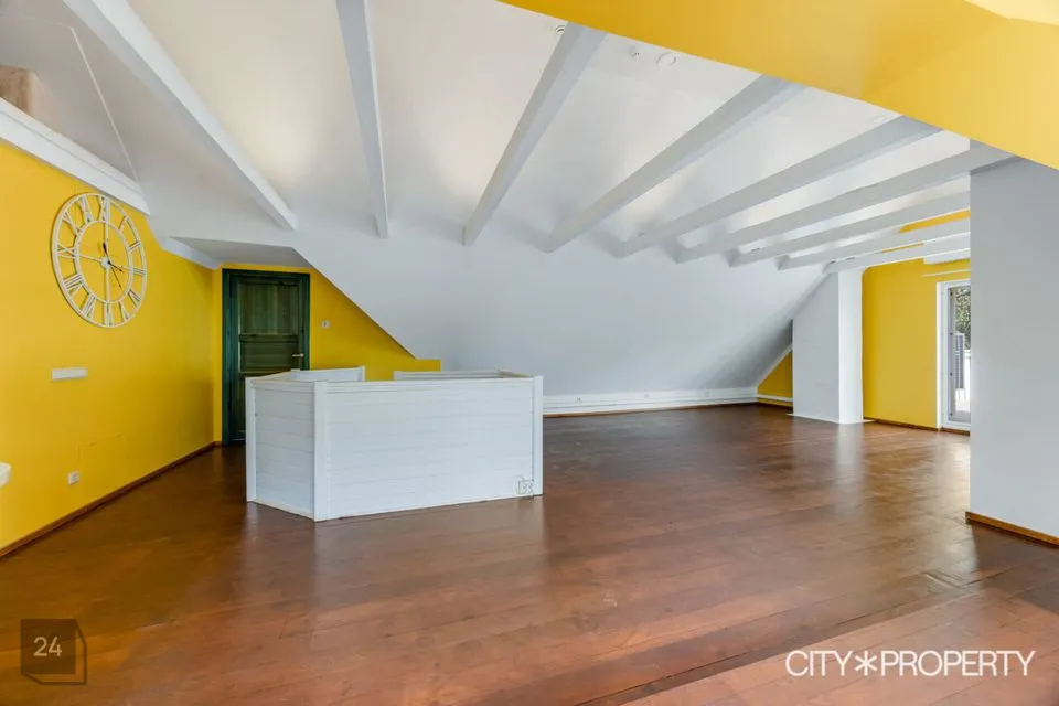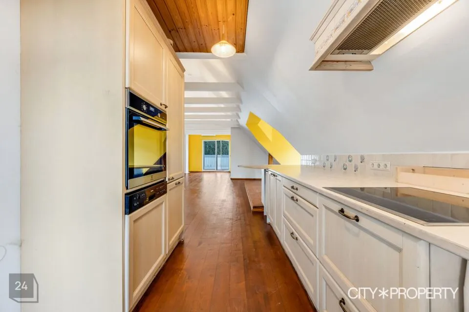 Pääsküla rahulikul vahetänaval, eestiaegse maja katusekorrusel asub hea potentsiaaliga, suur kahetoaline korter. Maja on tervikuna renoveeritud umbes 20 aasta eest ja samasse perioodi jääb ka müüdava korteri väljaehitamine ning siseviimistlus. Korteri planeering on lihtsalt muudetav kolmetoaliseks, kui torniga ärklituba vaheseinaga eraldada. Hetkel moodustavad elupinna kõrge kaldlaega elutuba koos avatud köögiga ning magamistuba. Eluruumi kahepoolsed otsauksed saab avada mõnusale suurele terrassile (23m2), kuhu paistab hommiku ning keskpäeva päike. Lisaks asub elutoas ka mahukas panipaik, kuhu on paigaldatud pesumasin.