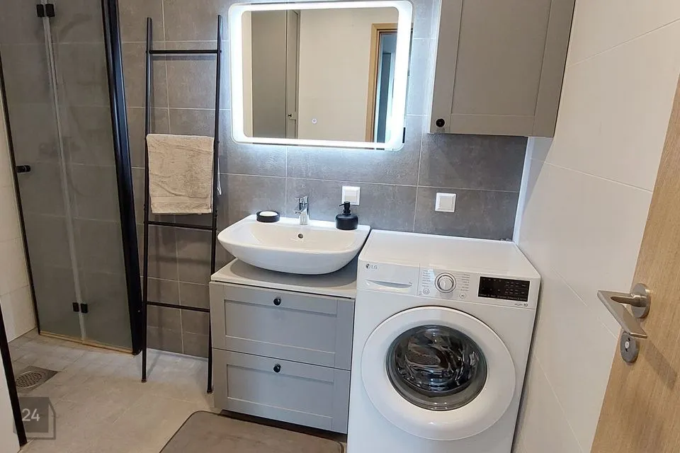 Kappid, peegel ja LG pesumasin dussiruumis.