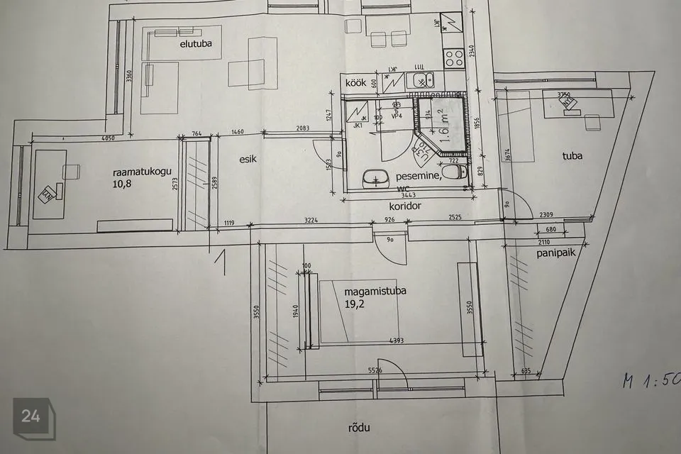 Esik, köök/elutuba, söögituba, kaks magamistuba, garderoob, vannituba/WC.