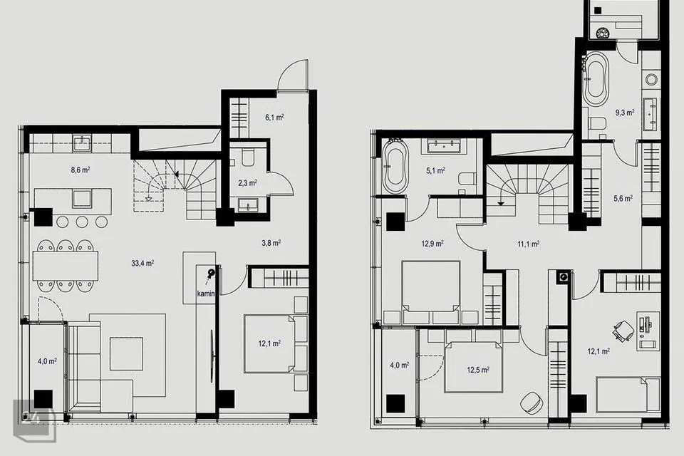 Planeering: esimesel korrusel on üks magamistuba, kaminaga, suur avatud köögiga elutuba, üks kahest väiksest rõdust ja tualetruum. Teisel tasapinnal asuvad disainvanni ja dušiga vannituba ning 3 magamistuba. Teisel tasapinnal on 3 magamitsuba, suur walk-in garderoob, vanniga vannituba ning eraldi sauna ja dušiga vannituba. Samuti olemas väike rõdu. Suur rõhku on pandud valguslahendustele.