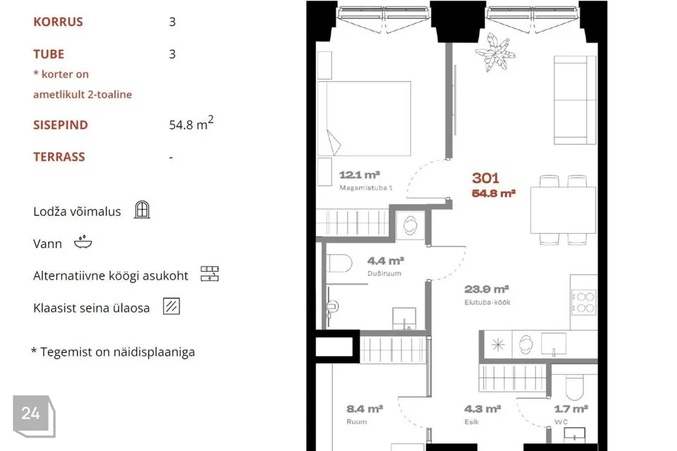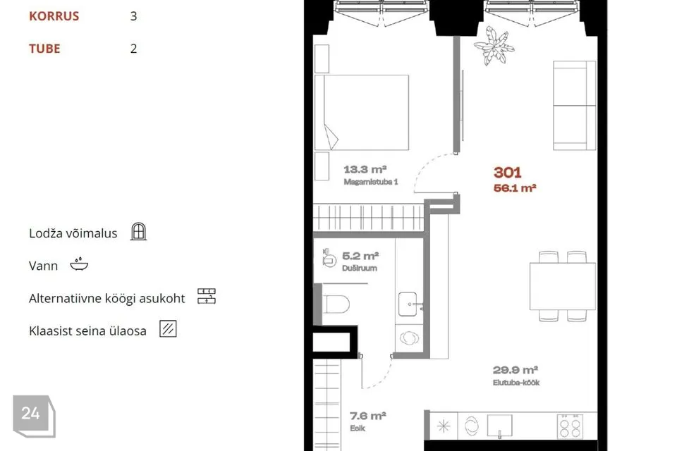 Korteri saab luua nii 2- kui 3-toalisena. Vali ise, kumb sobib paremini sinu elustiiliga! Lisatoa saab eraldada ka klaasist seintega, et säilitada rohkem valgust.