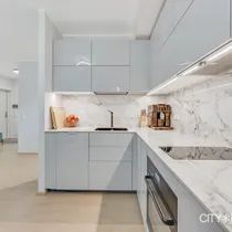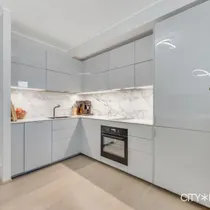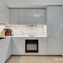 Stiilne kvaliteetne köögimööbel on varustatud kogu vajaliku integreeritud tehnikaga: külmkapp, pliit, ahi, kubu ja nõudepesumasin.