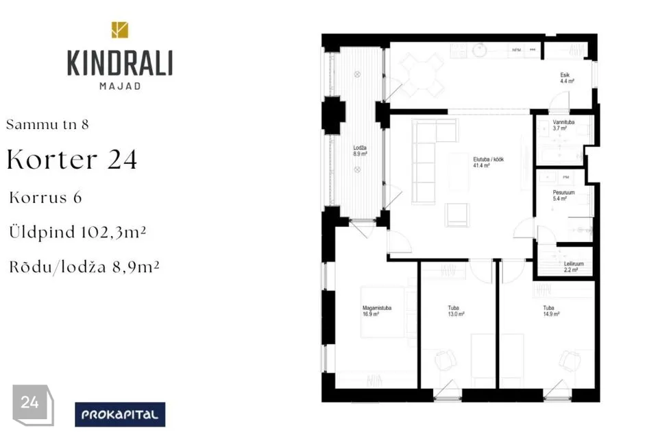 Selles korteris on kõik, mida suurel perel on vaja: kaks pesuruumi, avar elutuba ja mõnus lõunapoolne lodža, mis on kui elutoa pikendus. Korteris on eraldi vannituba ja duširuum saunaga. Soojustagastusega ventilatsioon tagab hea õhuvahetuse kõikides tubades nii talvel kui suvel.