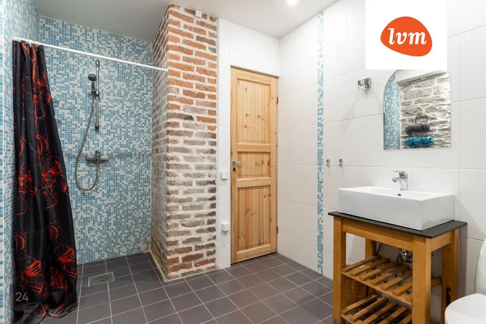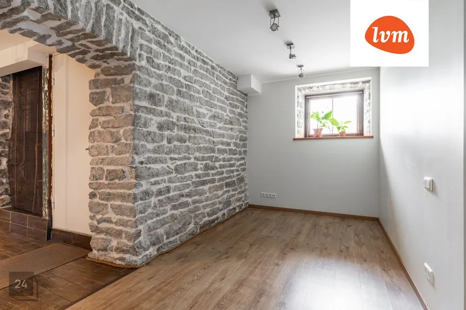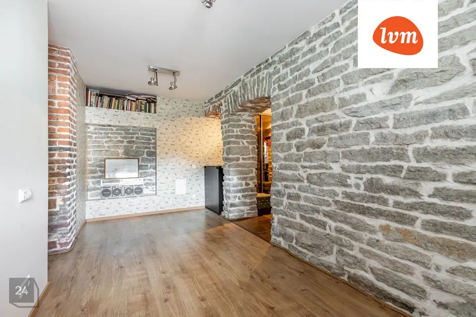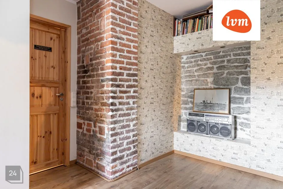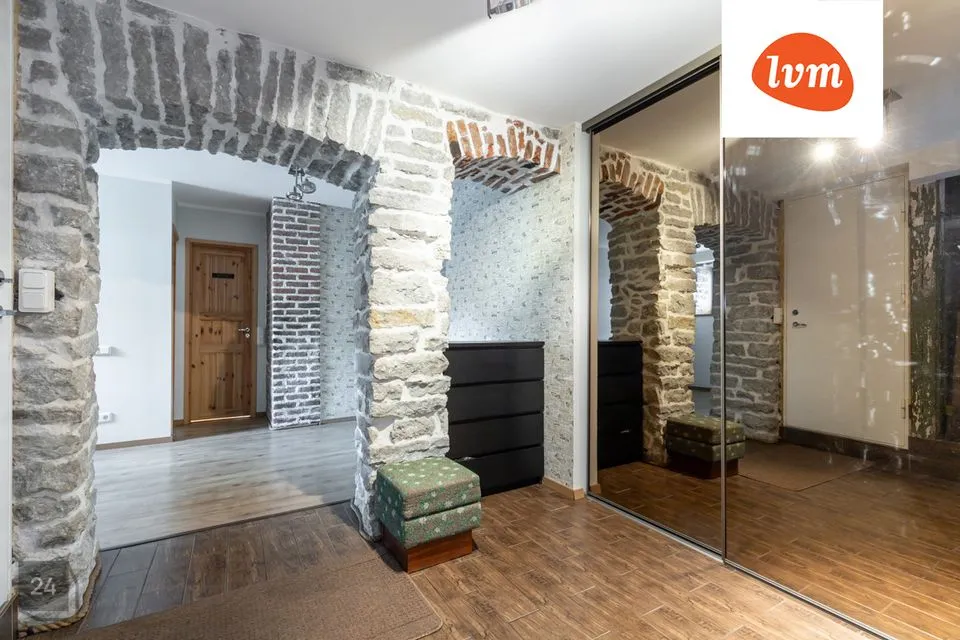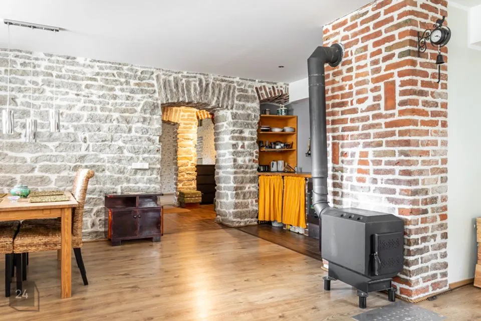 Korter on viimistletud heledates toonides, aktsenti annab jõuline paekivi ning punane tellis.