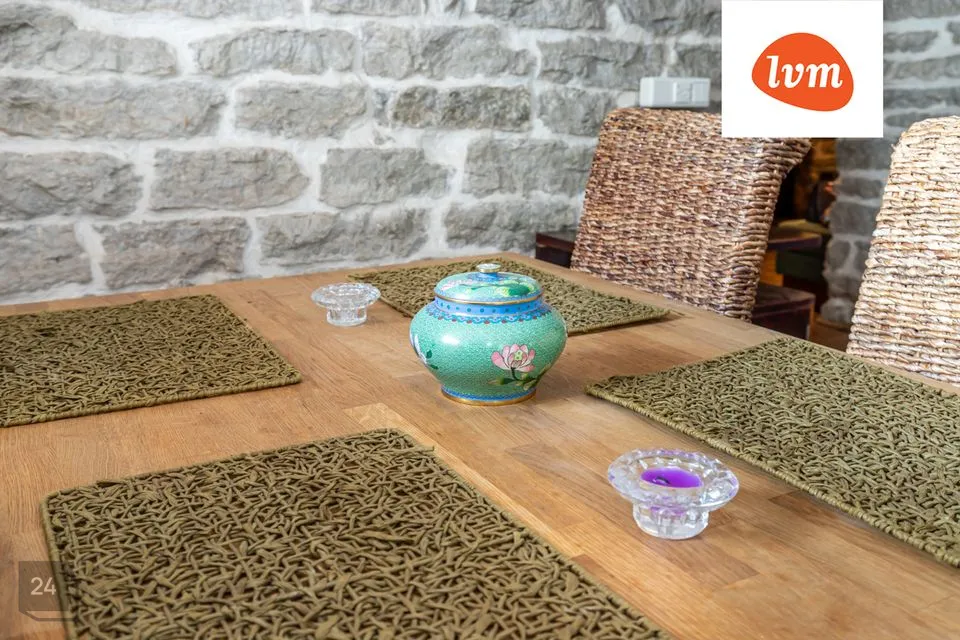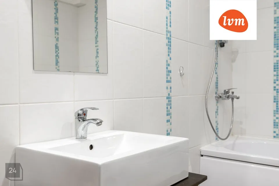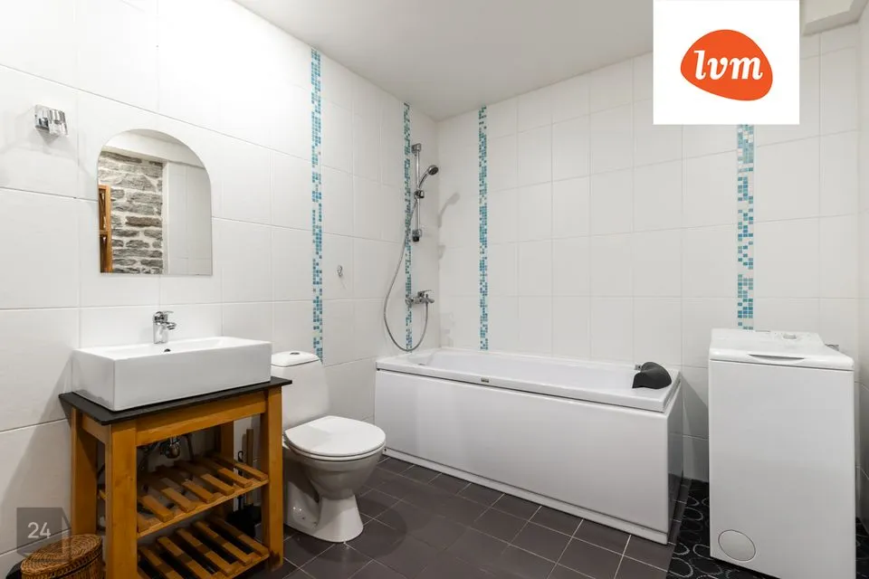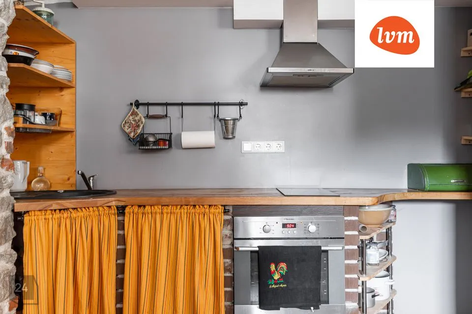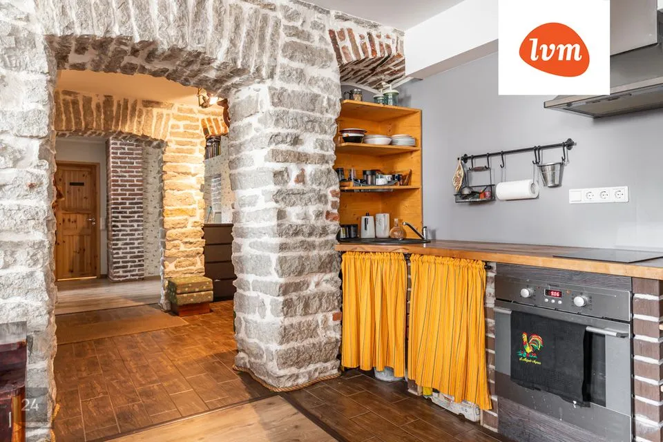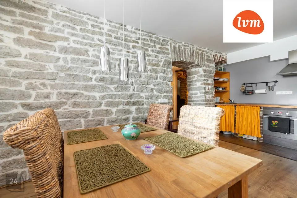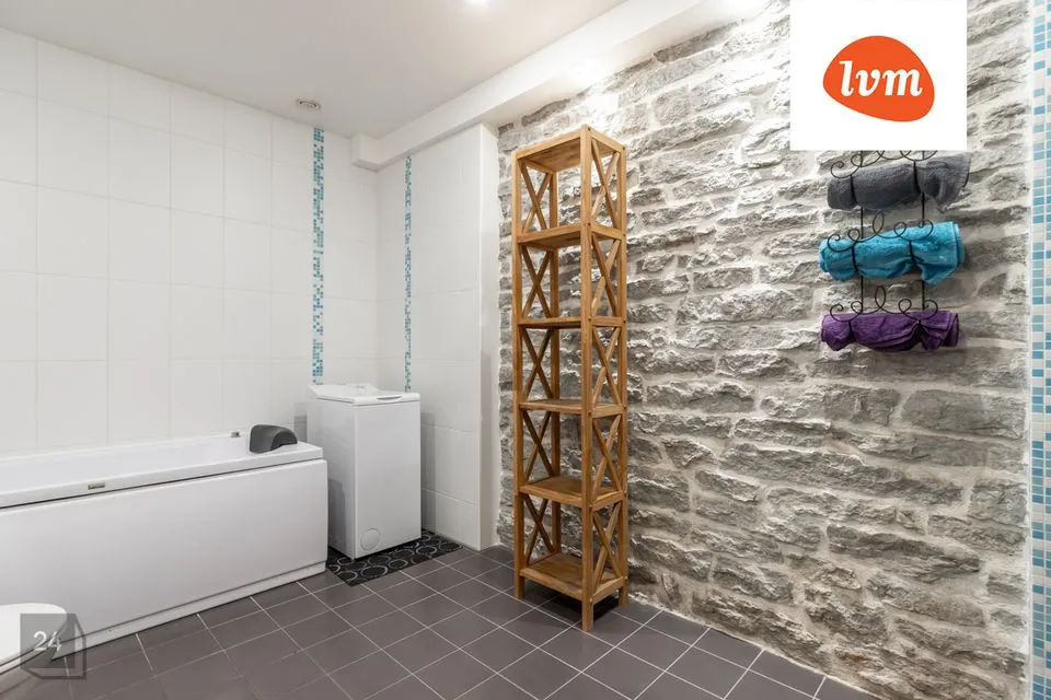 Korter on viimistletud heledates toonides, aktsenti annab jõuline paekivi ning punane tellis.