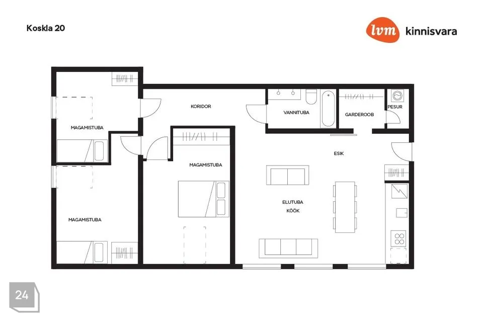 suur avatud köök-elutuba; eraldi garderoobi- ja majapidamisruum; vanniga pesuruum ja kolm magamistuba.