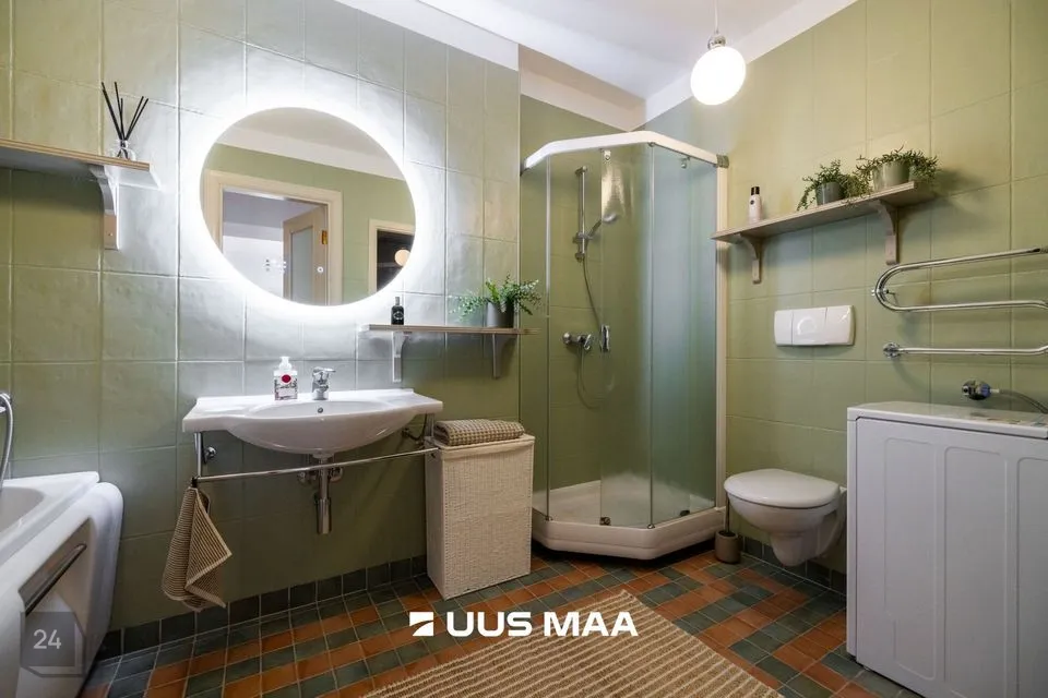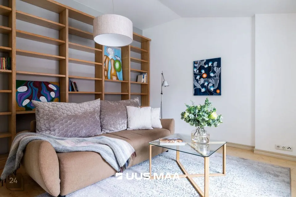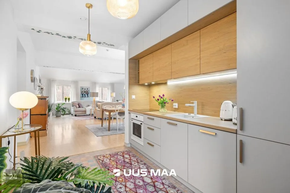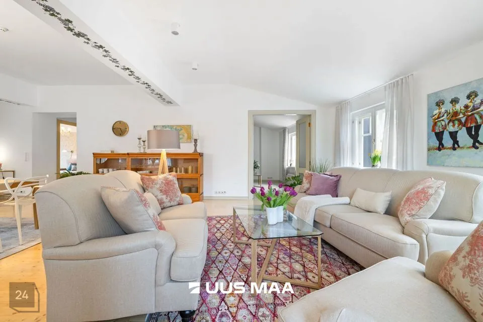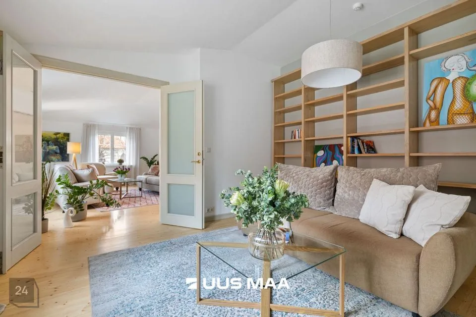 Avar, läbi maja planeeringuga korteri vaated avanevad erinevatesse suundadesse. Korteri koosseisu kuulub: esik, külaliste tualett, panipaik, väga avar elutuba, köök, kaks magamistuba, vannituba koos vanni, dušhi ja saunaga.